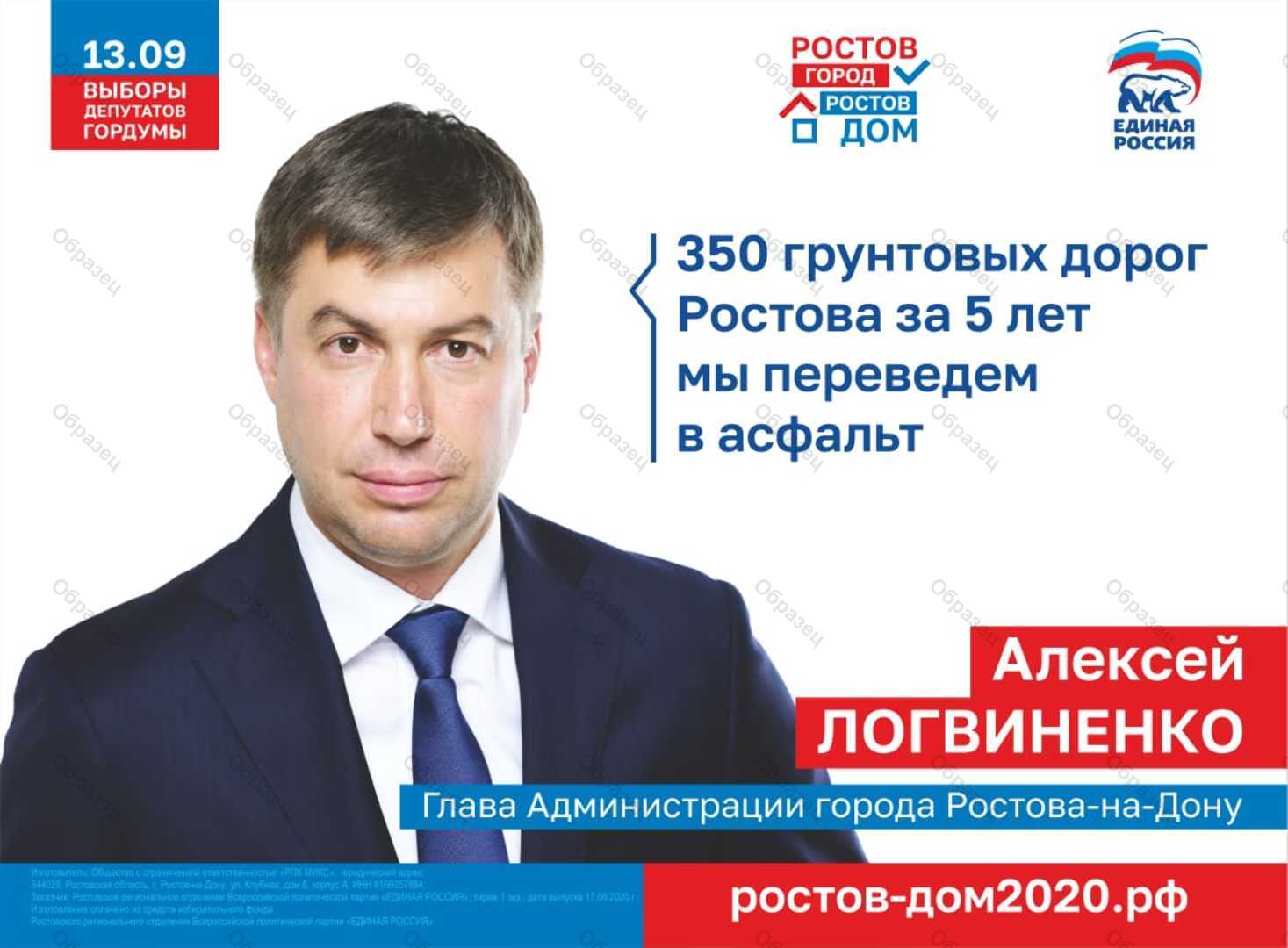 | Наименование агитационного материала | Логвиненко А.В., "350 грунтовых дорог Ростова за 5 лет мы переведем в асфальт" |