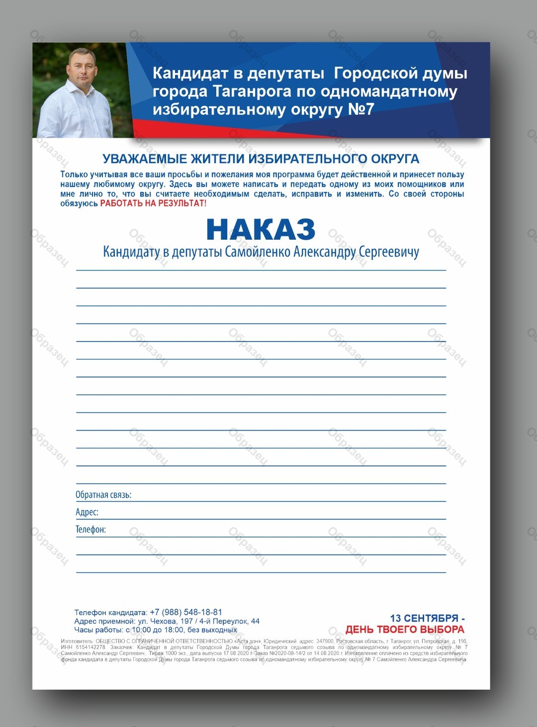 | Наименование агитационного материала | Наказ кандидату в депутаты Самойленко Александру Сергеевичу |