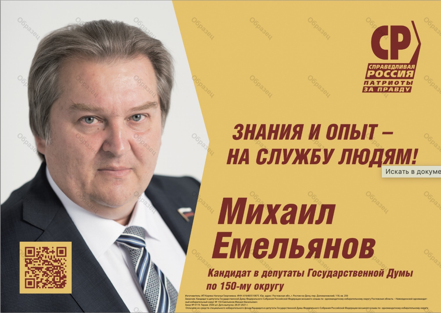 Оплачено из средств избирательного фонда кандидата в депутаты ГД ФС РФ восьмого созыва по Нижнедонскому одномандатному избирательному округу № 150 Емельянова М.В.