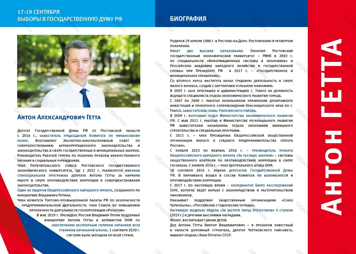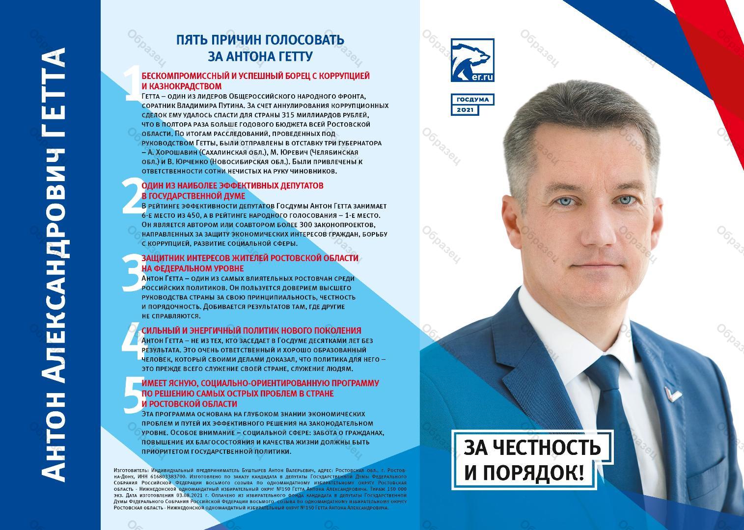 | Наименование агитационного материала | Антон Гетта - За честность и порядок! |