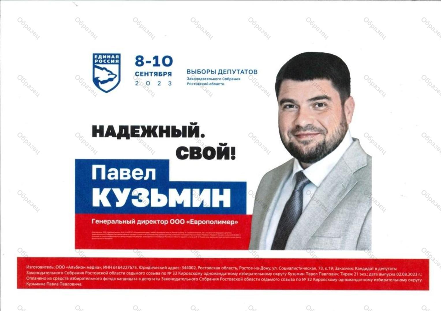 Оплачено из средств избирательного фонда кандидата в депутаты ЗС РО седьмого созыва Кузьмина Павла Павловича