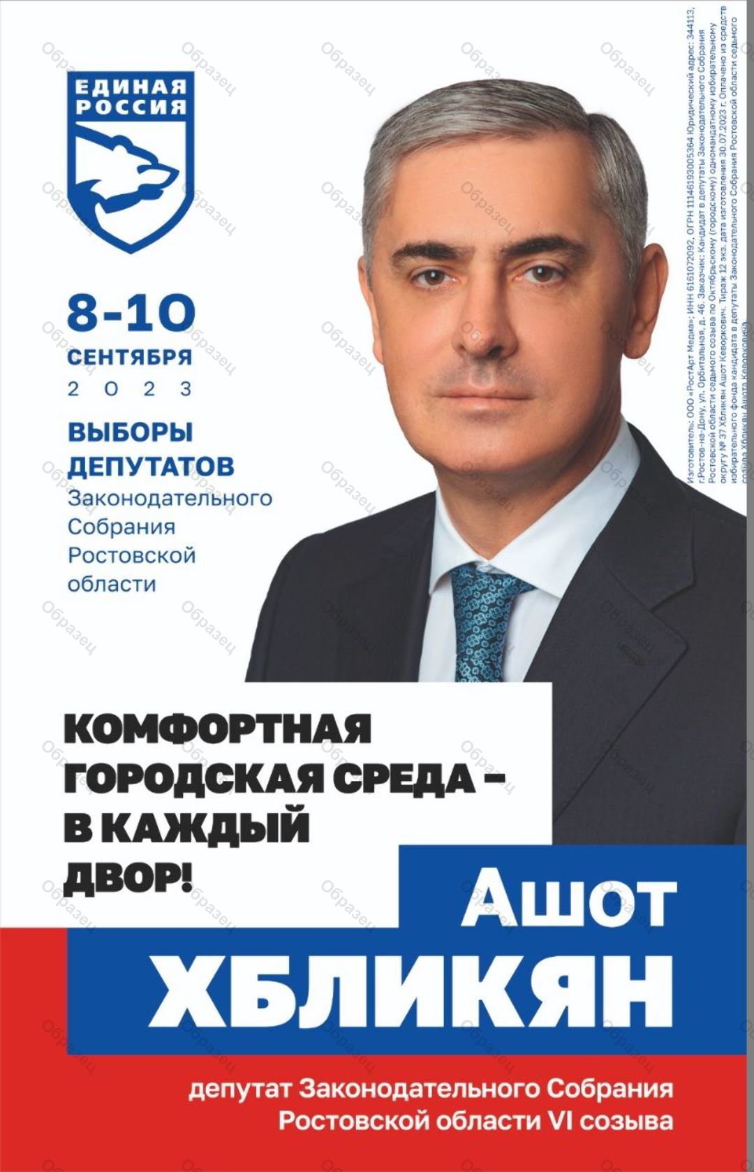 Оплачено из средств избирательного фонда кандидата в депутаты Законодательного Собрания Ростовской области седьмого созыва по Октябрьскому (городскому) одномандатному избирательному округу №37 Хбликяна Ашота Кеворковича