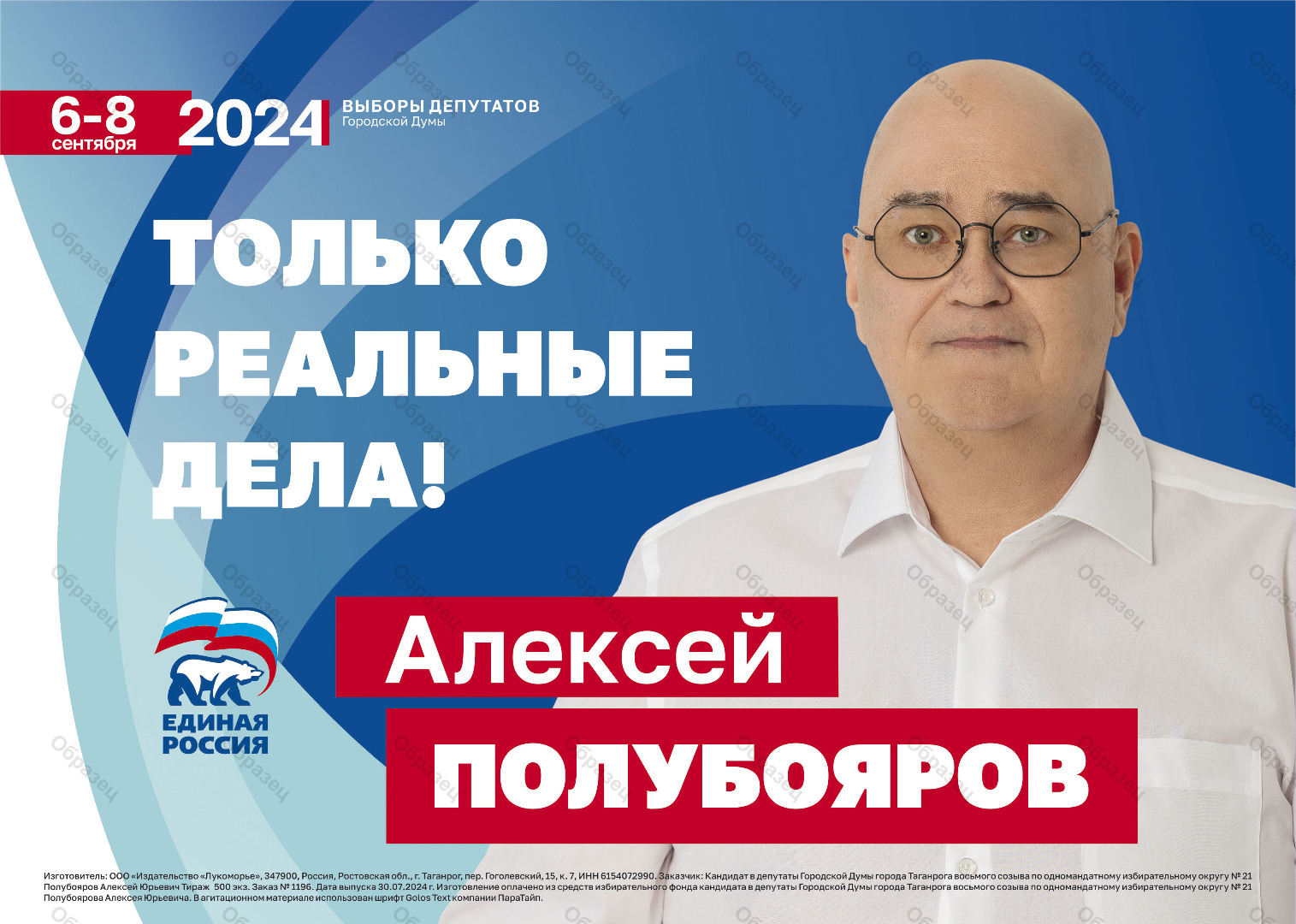 Оплачено за счет средств избирательного фонда кандидата в депутаты Городской Думы города Таганрога восьмого созыва по одномандатному избирательному округу № 21 Полубоярова Алексея Юрьевича
