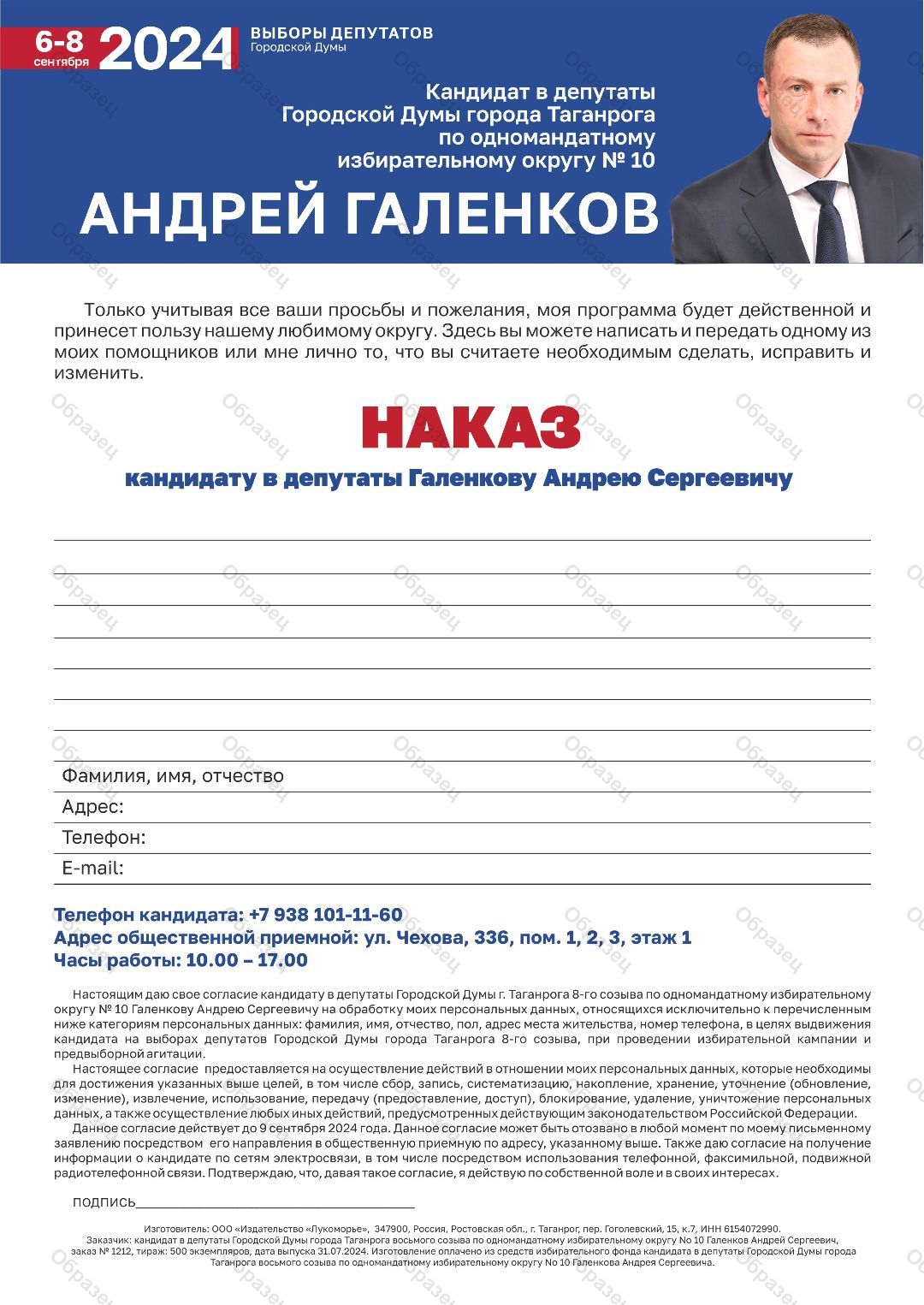 Оплачено за счет средств избирательного фонда кандидата в депутаты Городской Думы города Таганрога восьмого созыва по одномандатному избирательному округу № 10 Галенкова Андрея Сергеевича