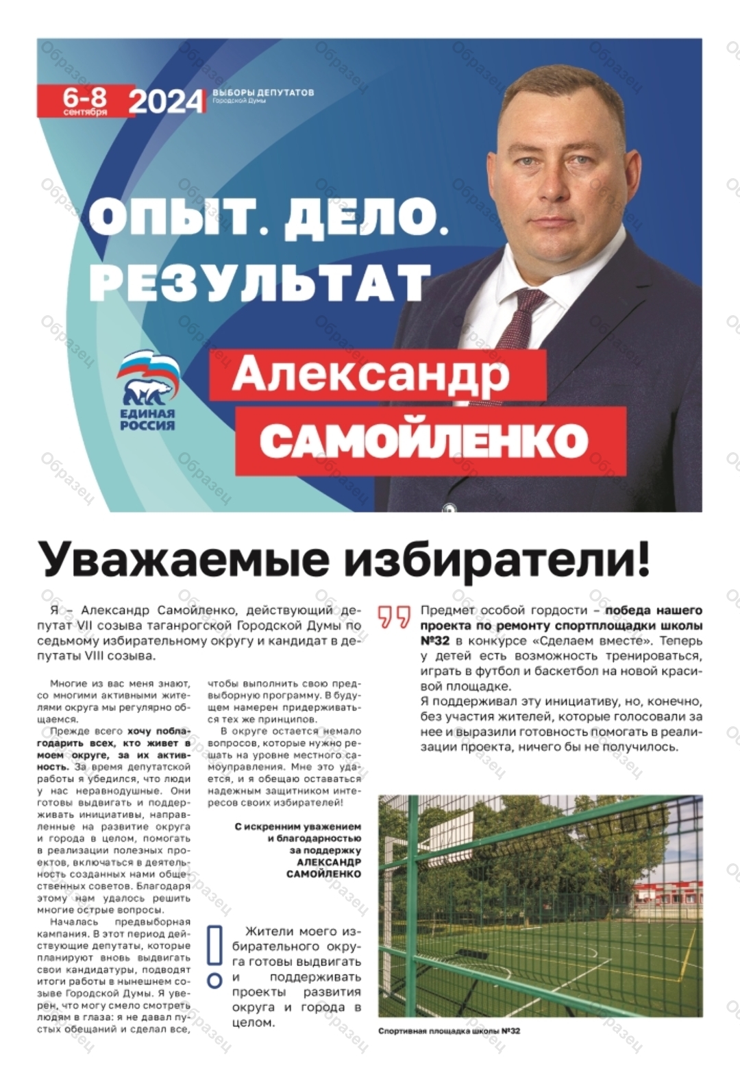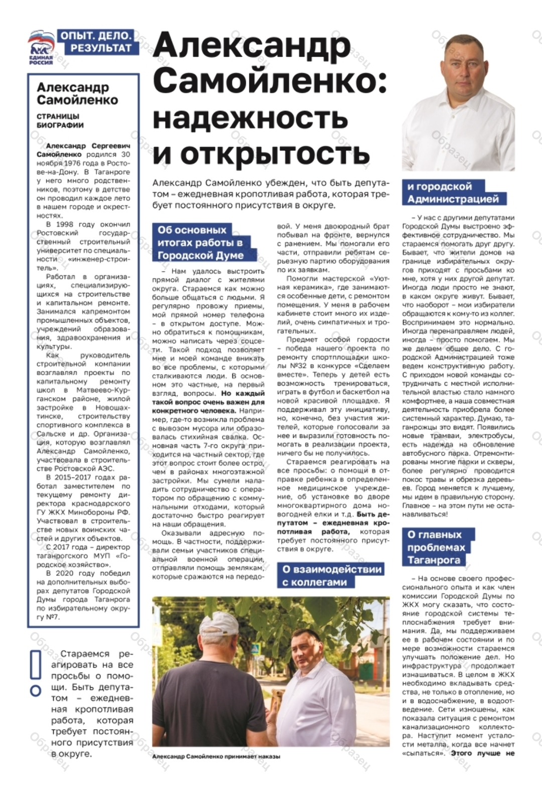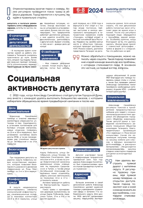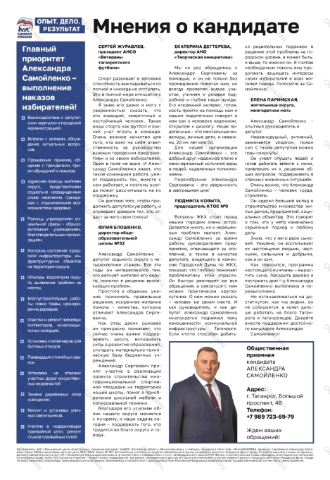 Оплачено за счет средств избирательного фонда кандидата в депутаты Городской Думы города Таганрога восьмого созыва по одномандатному избирательному округу № 7 Самойленко Александра Сергеевича