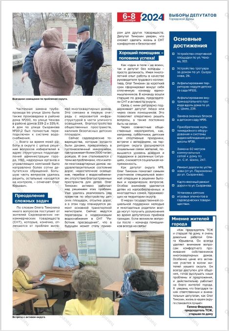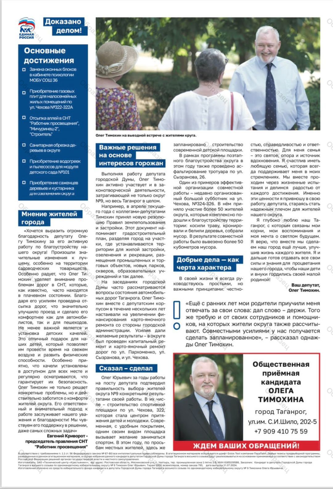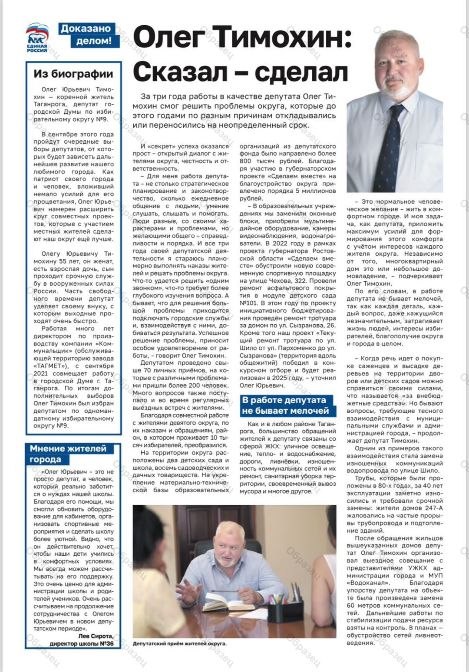 Оплачено за счет средств избирательного фонда кандидата в депутаты Городской Думы города Таганрога восьмого созыва по одномандатному избирательному округу № 9 Тимохина Олега Юрьевича