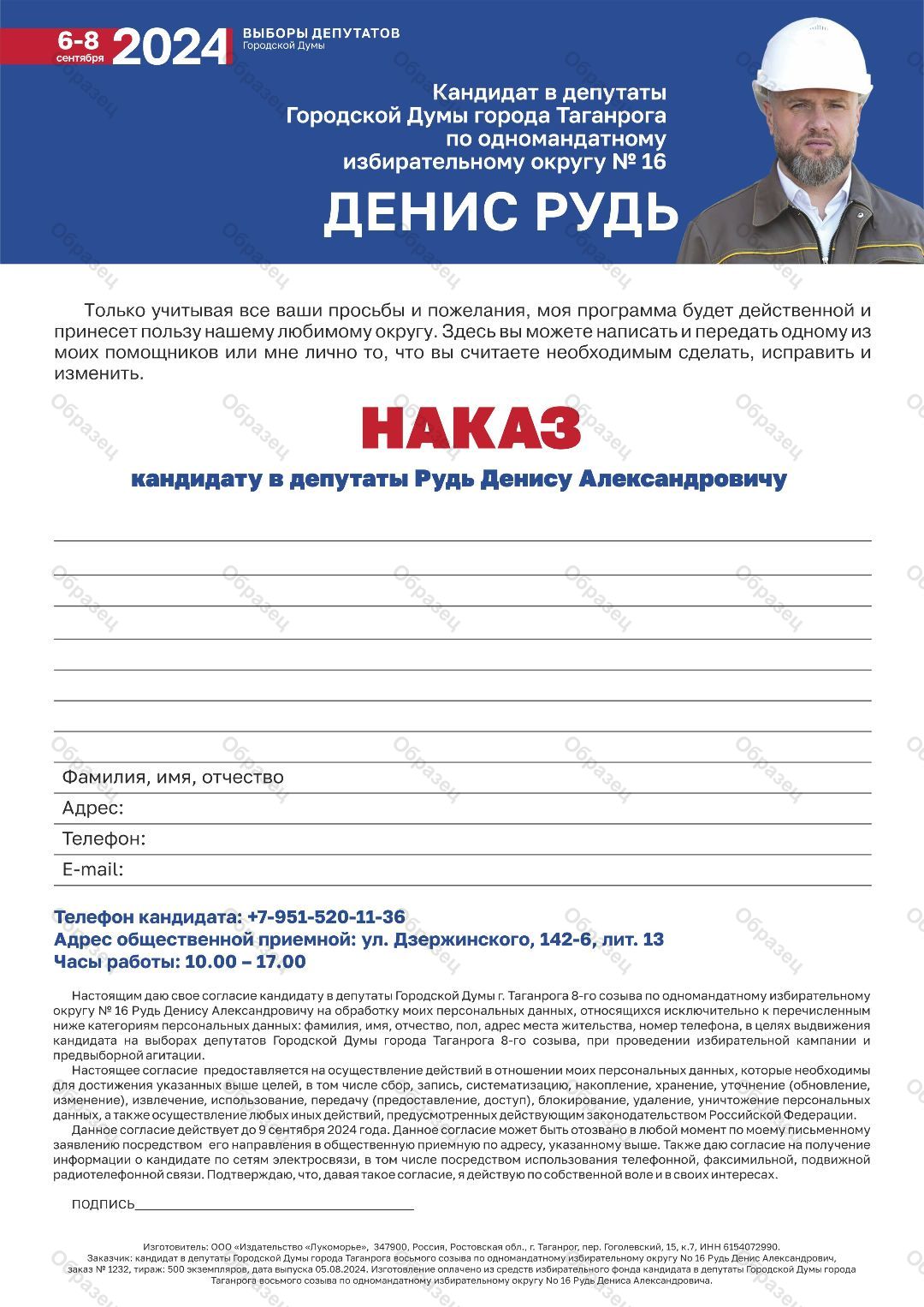 Оплачено за счет средств избирательного фонда кандидата в депутаты Городской Думы города Таганрога восьмого созыва по одномандатному избирательному округу № 16 Рудь Дениса Александровича