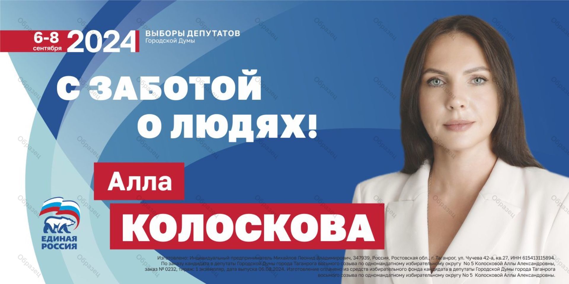Оплачено за счет средств избирательного фонда кандидата в депутаты Городской Думы города Таганрога восьмого созыва по одномандатному избирательному округу № 5 Колосковой Аллы Александровны