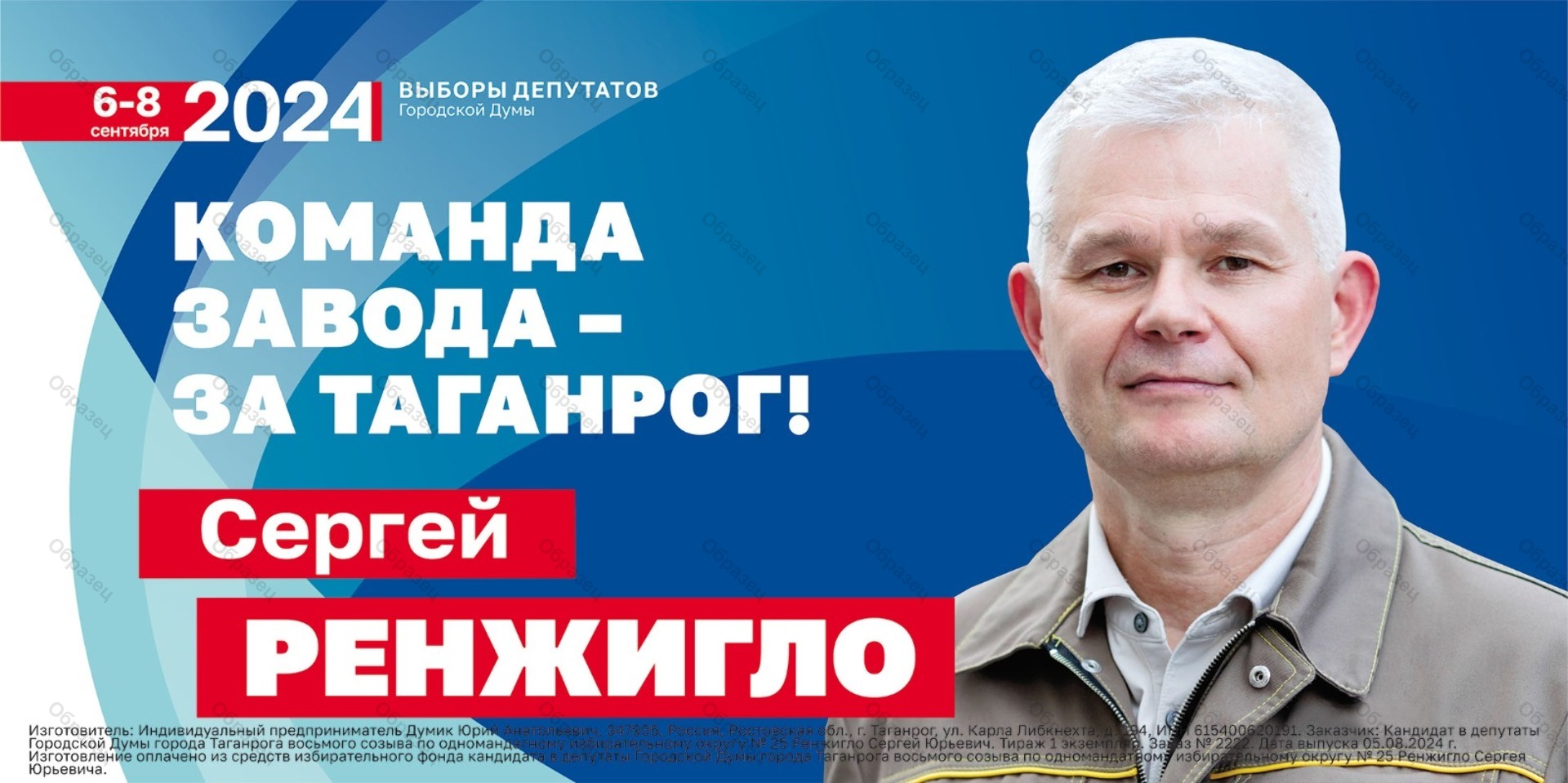 Оплачено за счет средств избирательного фонда кандидата в депутаты Городской Думы города Таганрога восьмого созыва по одномандатному избирательному округу № 25 Ренжигло Сергея Юрьевича