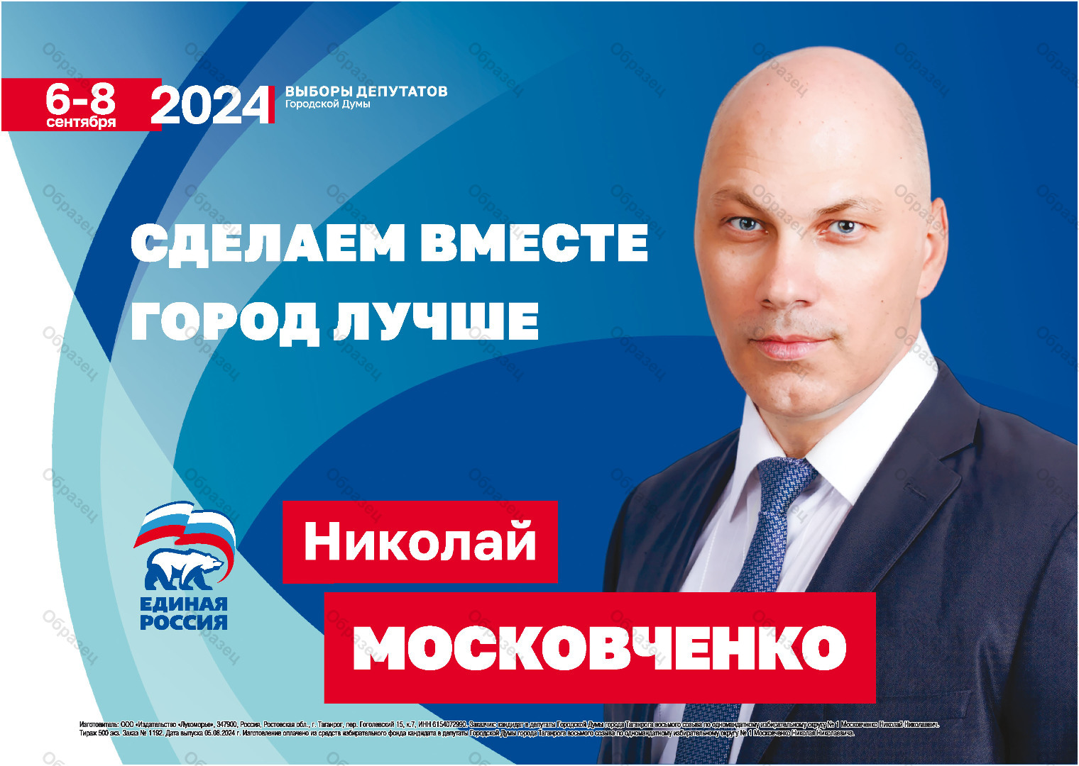 Оплачено за счет средств избирательного фонда кандидата в депутаты Городской Думы города Таганрога восьмого созыва по одномандатному избирательному округу № 1 Московченко Николая Николаевича