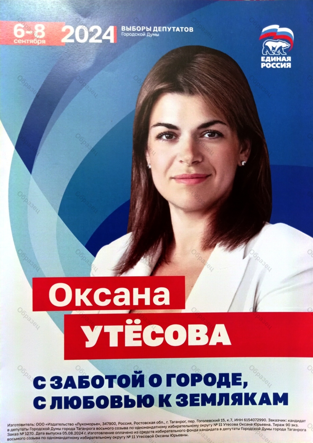 Оплачено за счет средств избирательного фонда кандидата в депутаты Городской Думы города Таганрога восьмого созыва по одномандатному избирательному округу № 11 Утесовой Оксаны Юрьевны