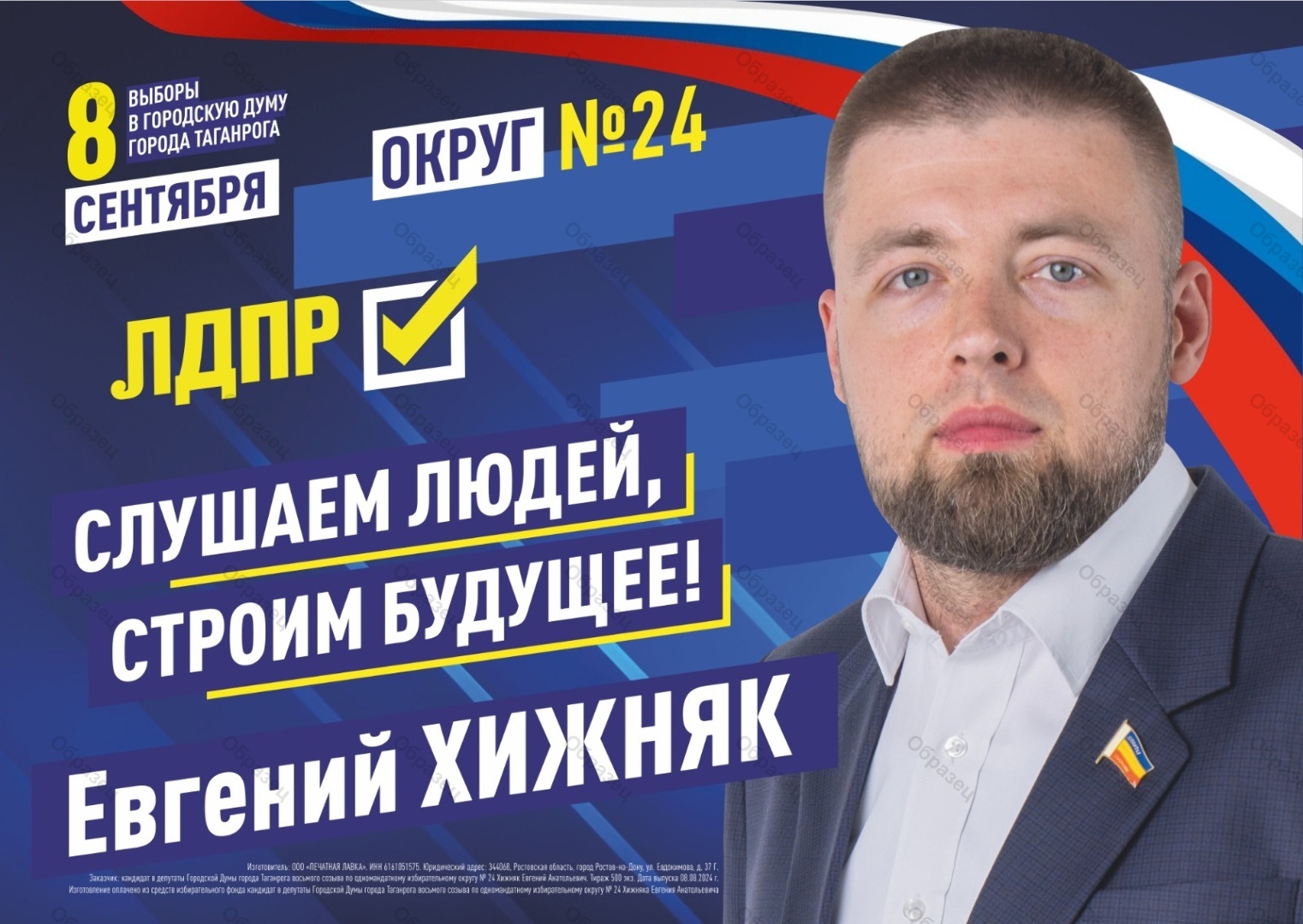 Оплачено за счет средств избирательного фонда кандидата в депутаты Городской Думы города Таганрога восьмого созыва по одномандатному избирательному округу № 24 Хижняка Евгения Анатольевича