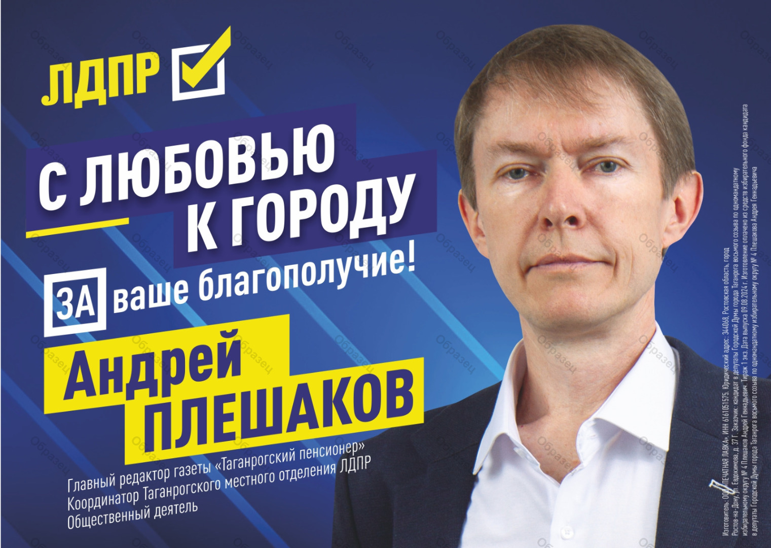 Оплачено за счет средств избирательного фонда кандидата в депутаты Городской Думы города Таганрога восьмого созыва по одномандатному избирательному округу № 4 Плешакова Андрея Геннадьевича
