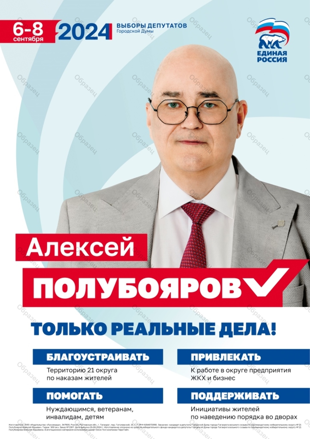 Оплачено за счет средств избирательного фонда кандидата в депутаты Городской Думы города Таганрога восьмого созыва по одномандатному избирательному округу № 21 Полубоярова Алексея Юрьевича