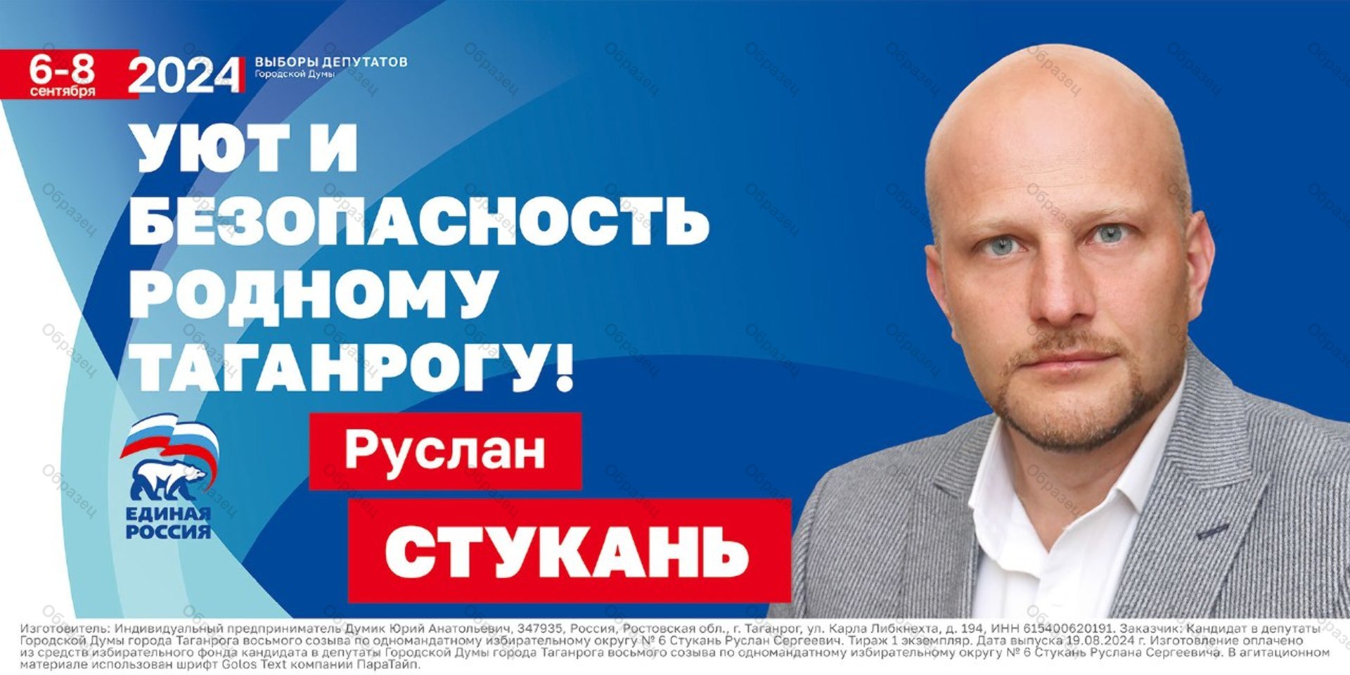 Оплачено за счет средств избирательного фонда кандидата в депутаты Городской Думы города Таганрога восьмого созыва по одномандатному избирательному округу № 6 Стукань Руслана Сергеевича