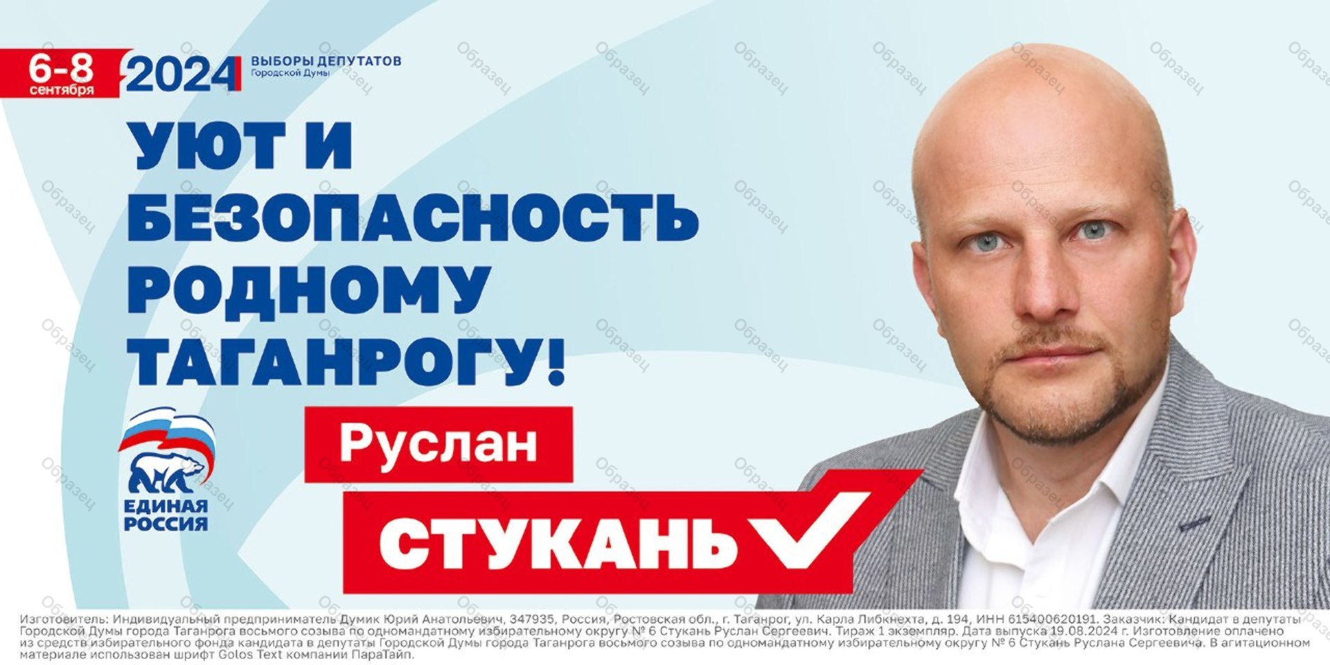 Оплачено за счет средств избирательного фонда кандидата в депутаты Городской Думы города Таганрога восьмого созыва по одномандатному избирательному округу № 6 Стукань Руслана Сергеевича
