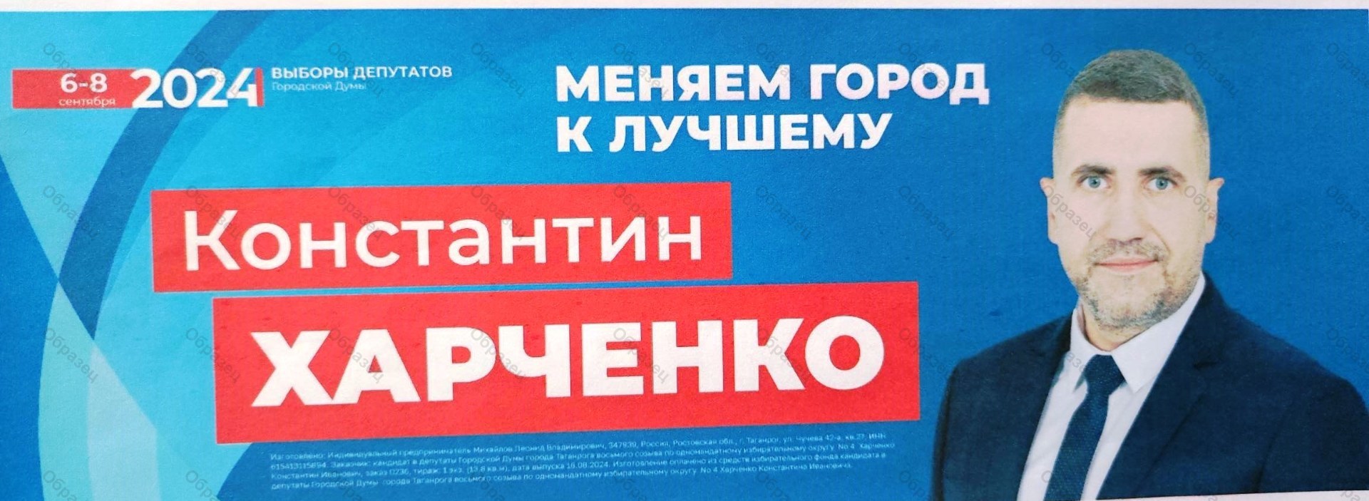 Оплачено за счет средств избирательного фонда кандидата в депутаты Городской Думы города Таганрога восьмого созыва по одномандатному избирательному округу № 4 Харченко Константина Ивановича