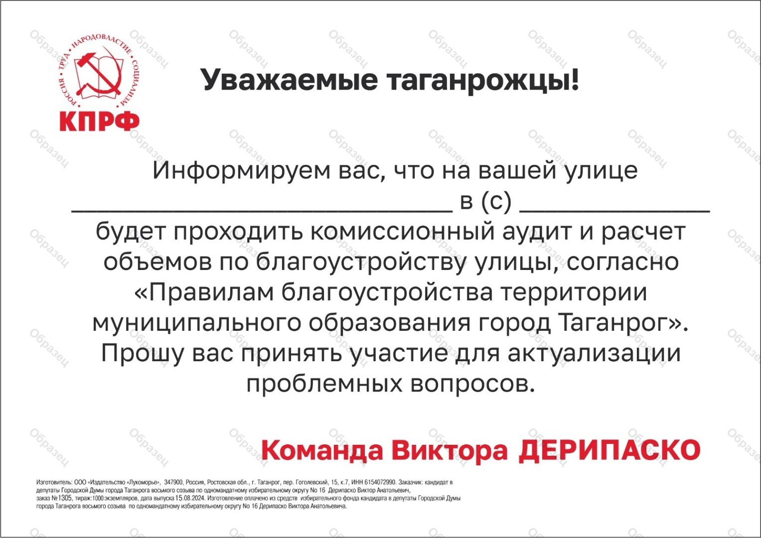 Оплачено за счет средств избирательного фонда кандидата в депутаты Городской Думы города Таганрога восьмого созыва по одномандатному избирательному округу № 16 Дерипаско Виктора Анатольевича