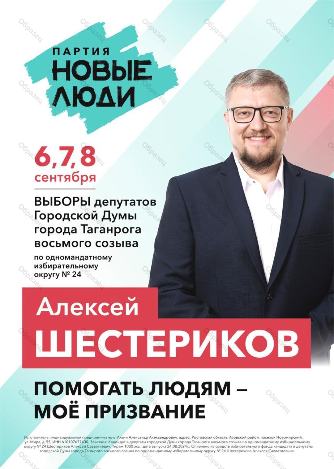 Оплачено за счет средств избирательного фонда кандидата в депутаты Городской Думы города Таганрога восьмого созыва по одномандатному избирательному округу № 24 Шестерикова Алексея Савватиевича