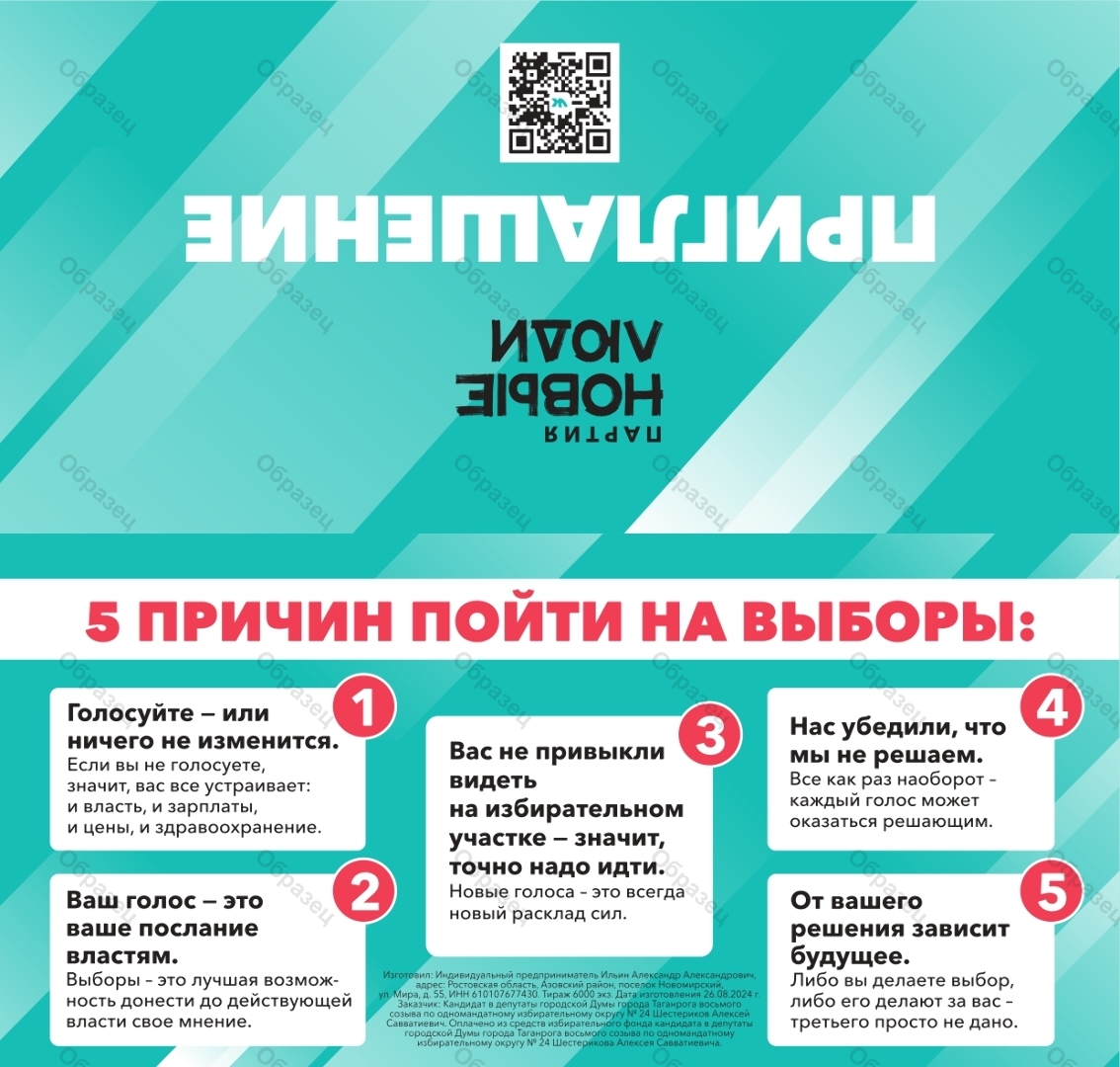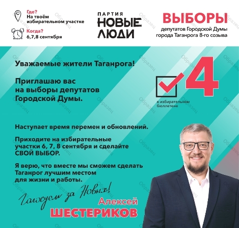 Оплачено за счет средств избирательного фонда кандидата в депутаты Городской Думы города Таганрога восьмого созыва по одномандатному избирательному округу № 24 Шестерикова Алексея Савватиевича