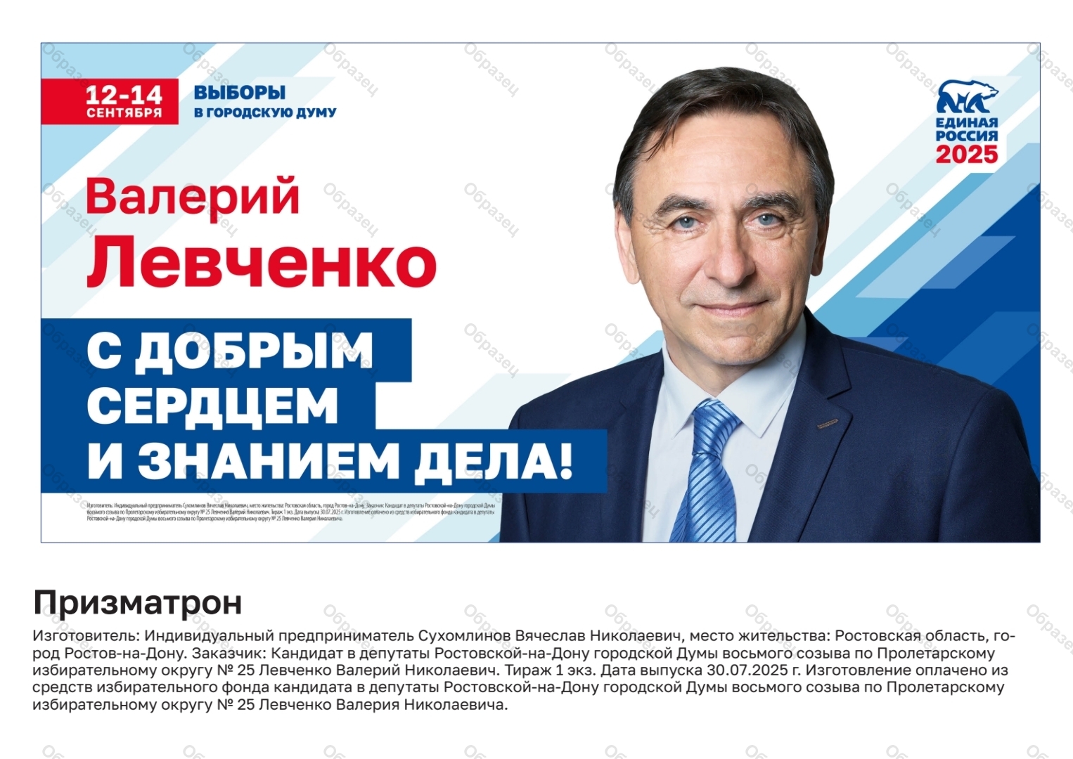 | Наименование агитационного материала | Агитационный материал для призматрона Валерий Левченко, "С добрым сердцем и знанием дела!" |
