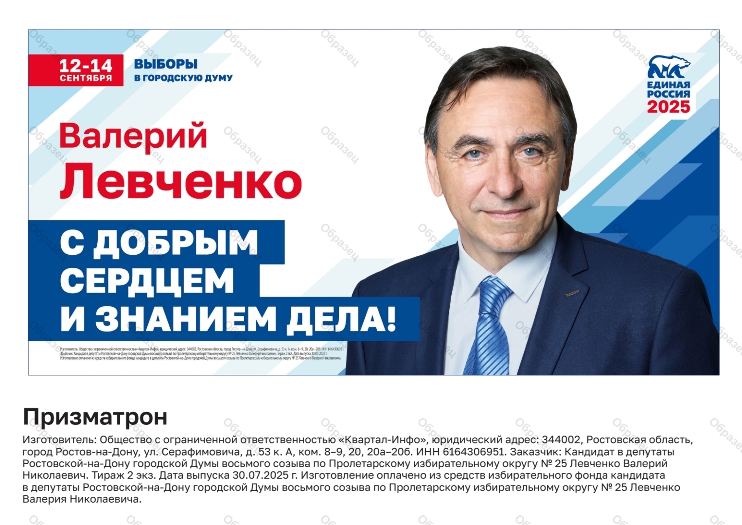 Оплачено из средств избирательного фонда кандидата в депутаты Ростовской-на-Дону городской Думы восьмого созыва Пролетарскому избирательному округу №25 Левченко Валерия Николаевича