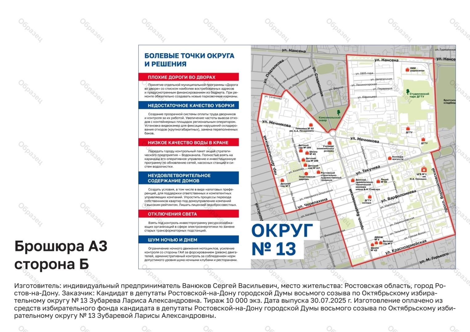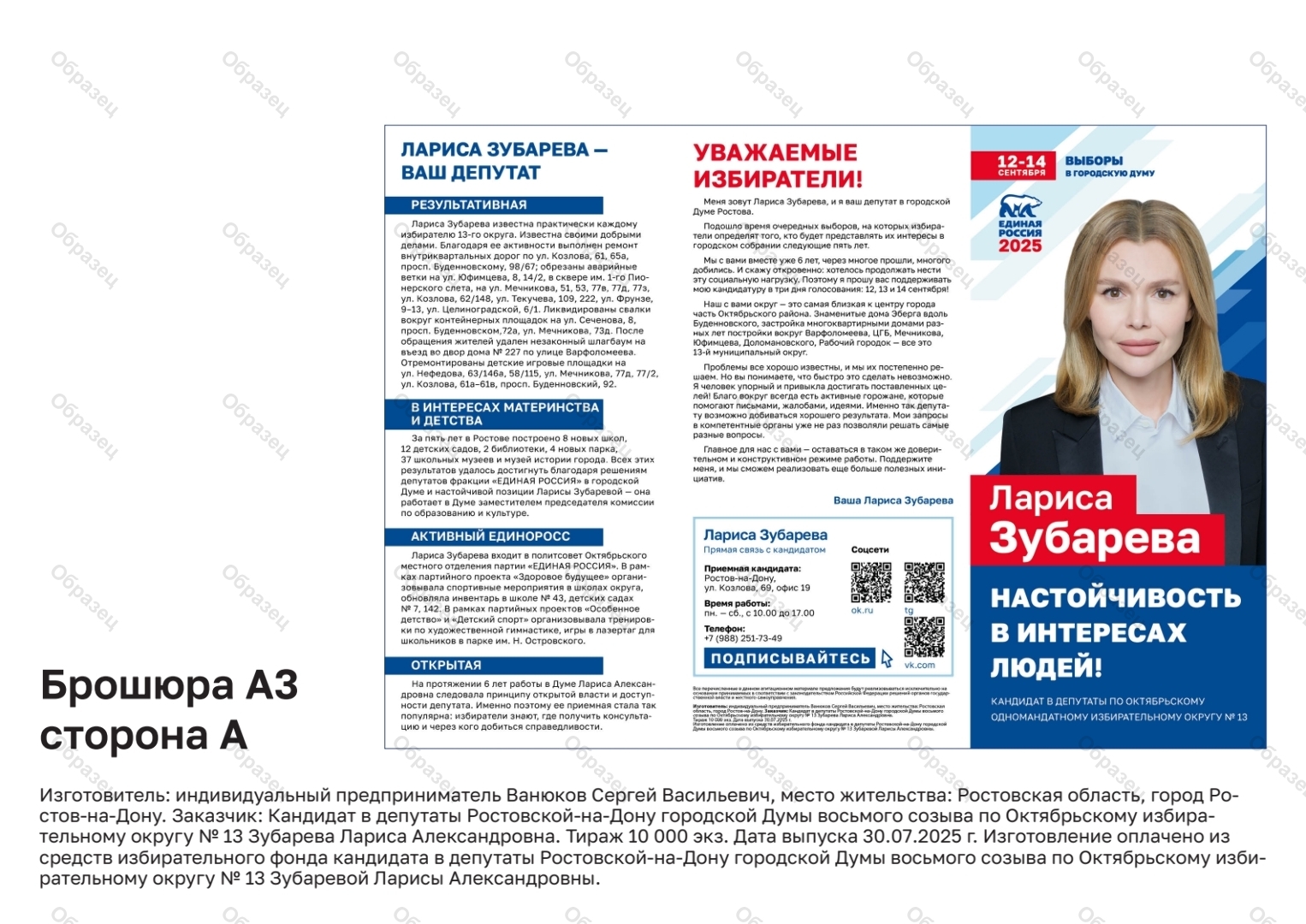 | Заказчик | кандидат в депутаты Ростовской-на-Дону городской Думы восьмого созыва по Октябрьскому избирательному округу № 13 Зубарева Лариса Александровна |