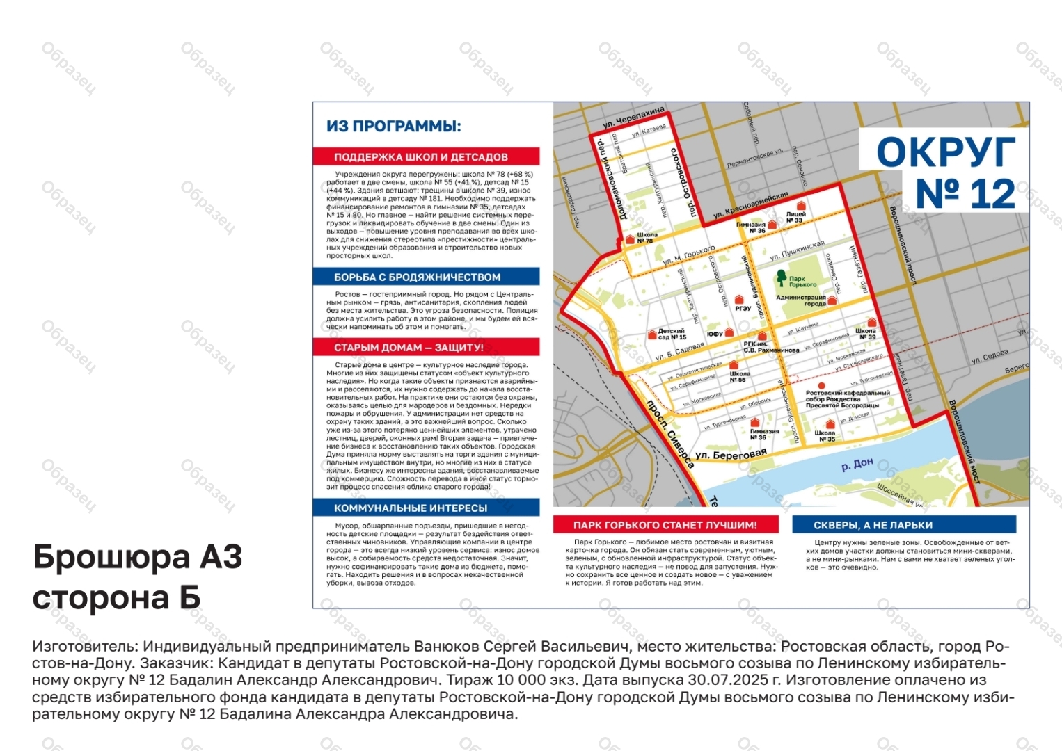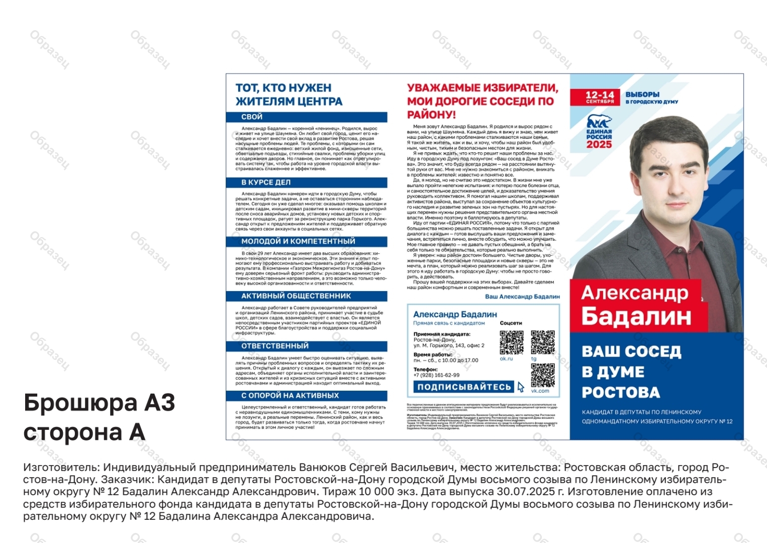 Оплачено из средств избирательного фонда кандидата в депутаты Ростовской-на-Дону городской Думы восьмого созыва по Ленинскому одномандатному избирательному округу № 12 Бадалина Александра Александровича