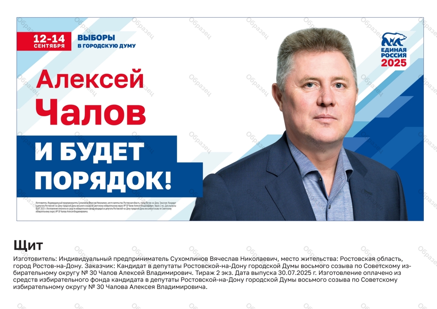 Оплачено из средств избирательного фонда кандидата в депутаты Ростовской-на-Дону городской Думы восьмого созыва по Советскому одномандатному избирательному округу № 30 Чалов Алексей Владимирович