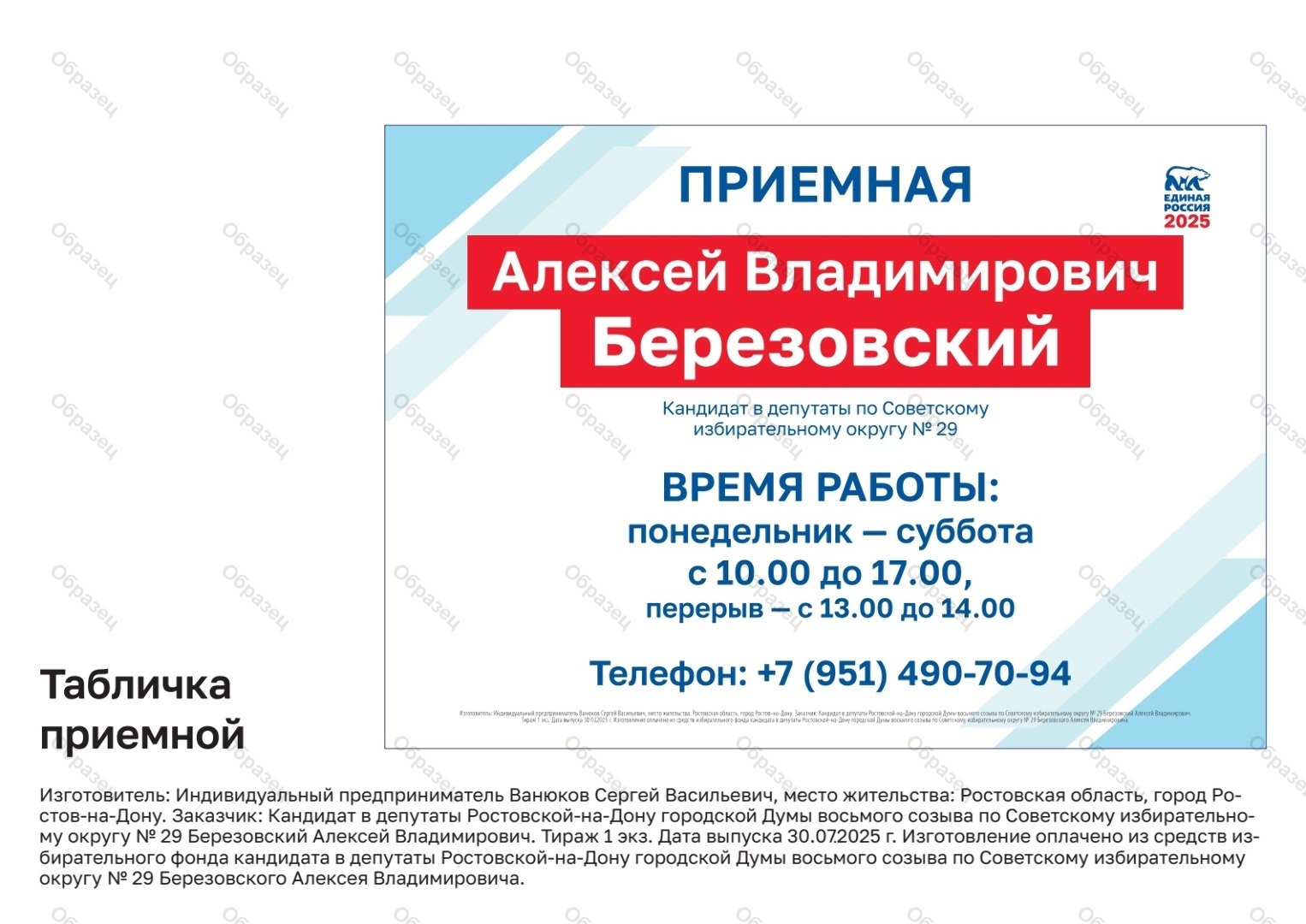 | Наименование агитационного материала | Приемная Алексей Владимирович Березовский |