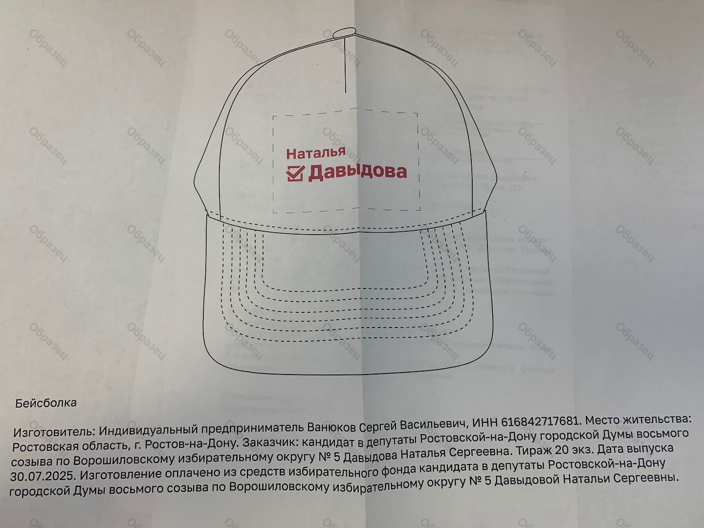 | Наименование агитационного материала | Бейсболка брендированная "Наталья Давыдова" |