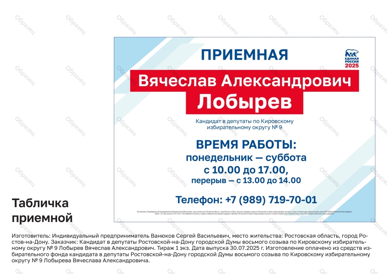 | Наименование агитационного материала | Приемная Вячеслав Александрович Лобырев |