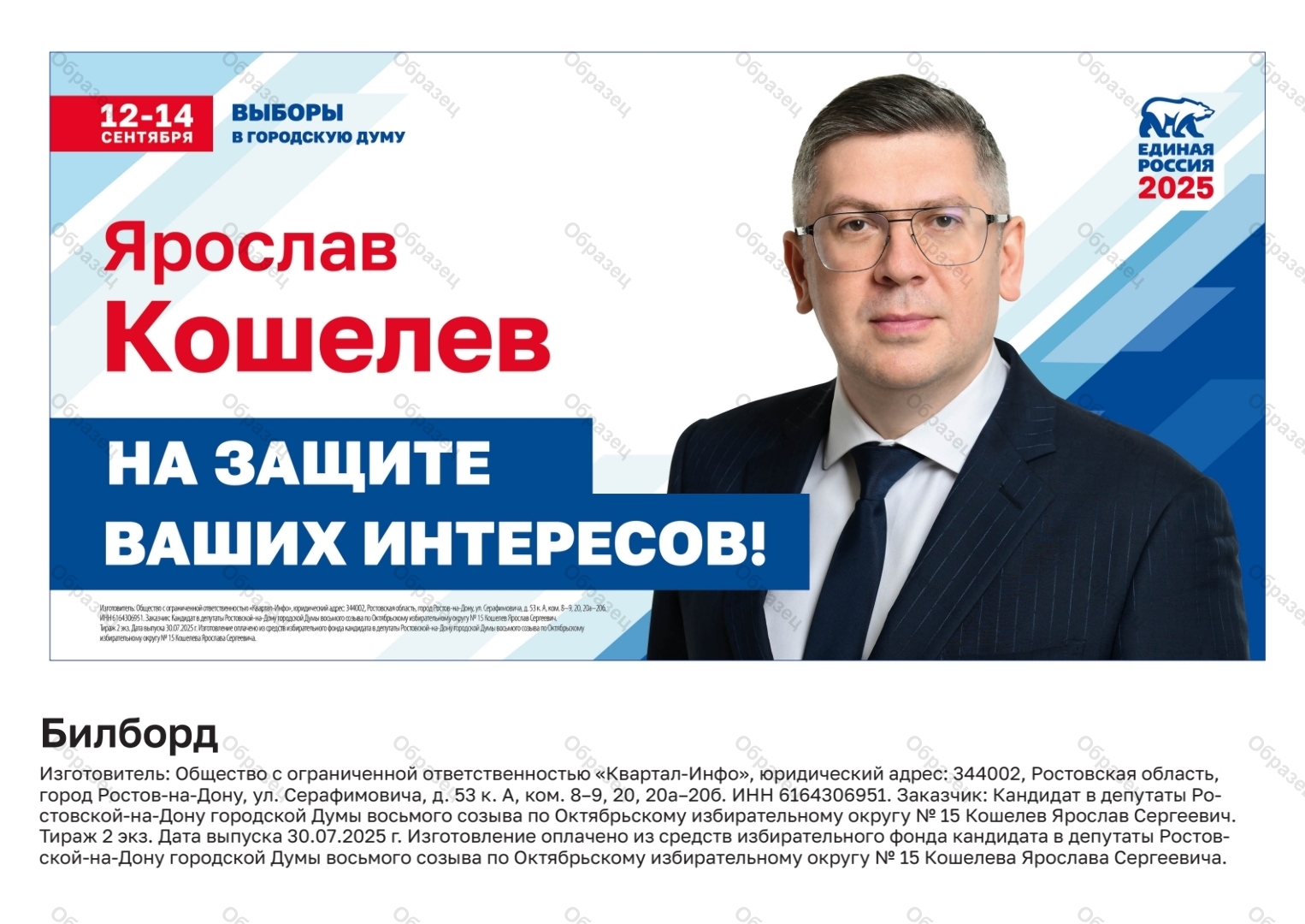 | Заказчик | кандидат в депутаты Ростовской-на-Дону городской Думы восьмого созыва по Октябрьскому избирательному округу № 15 Кошелев Ярослав Сергеевич |