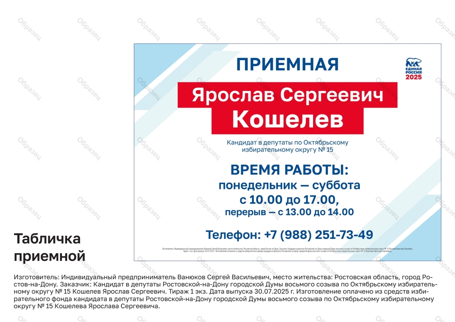 | Заказчик | кандидат в депутаты Ростовской-на-Дону городской Думы восьмого созыва по Октябрьскому избирательному округу № 15 Кошелев Ярослав Сергеевич |