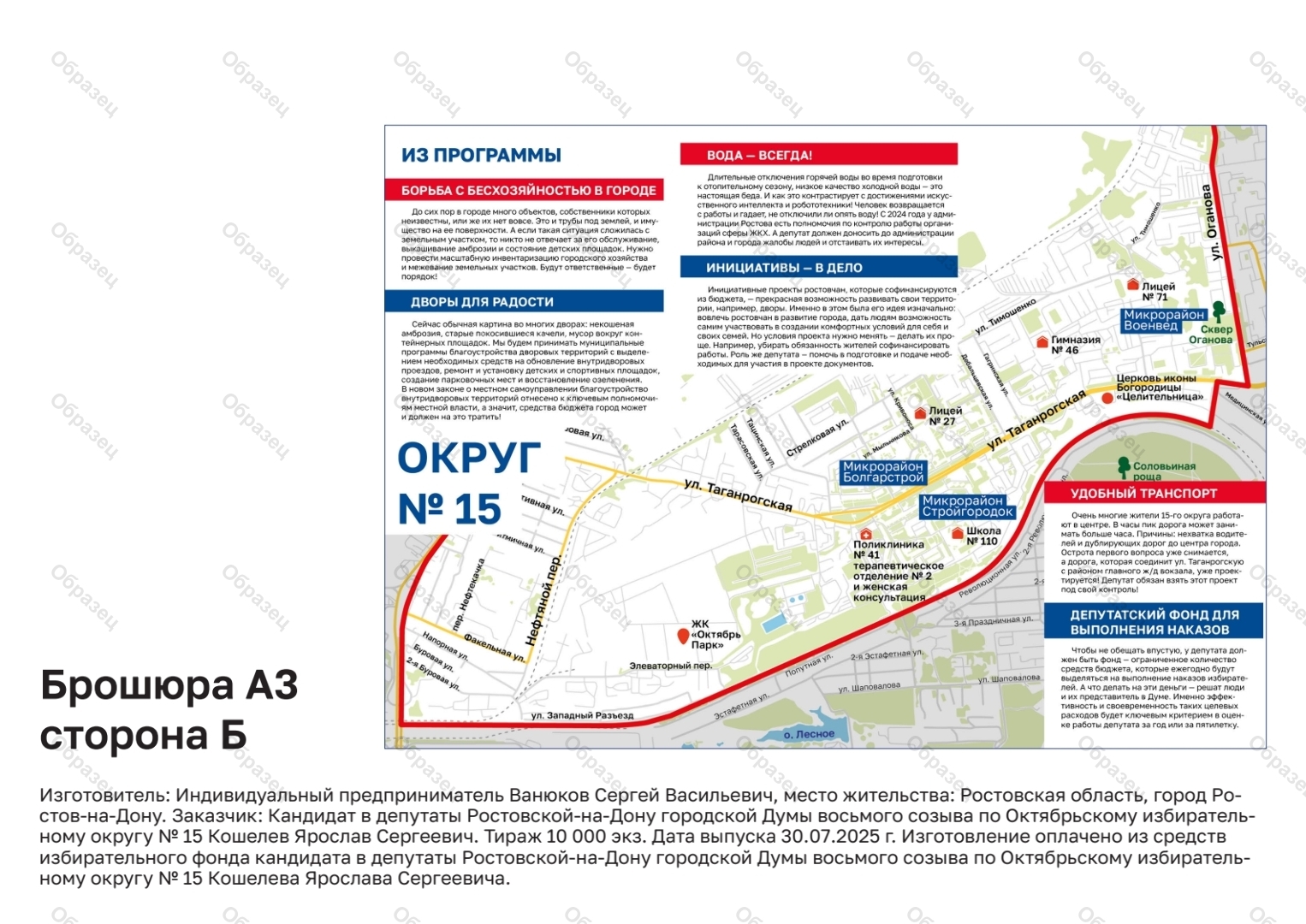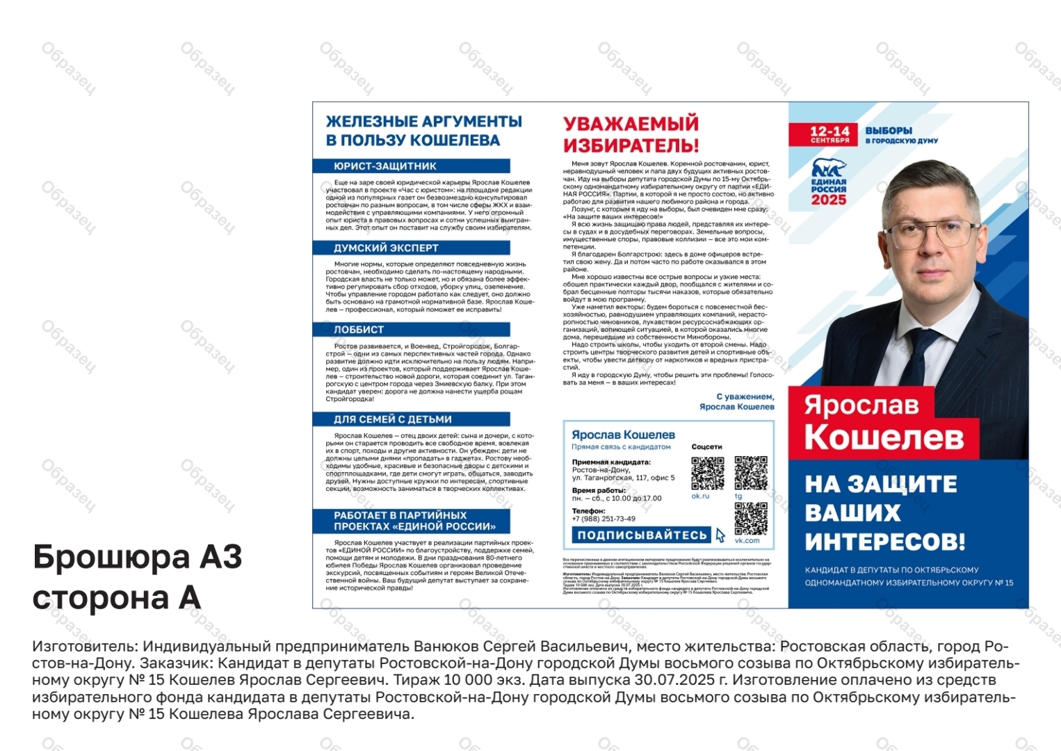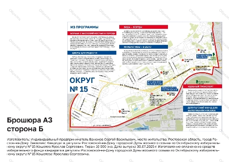 | Заказчик | кандидат в депутаты Ростовской-на-Дону городской Думы восьмого созыва по Октябрьскому избирательному округу № 15 Кошелев Ярослав Сергеевич |