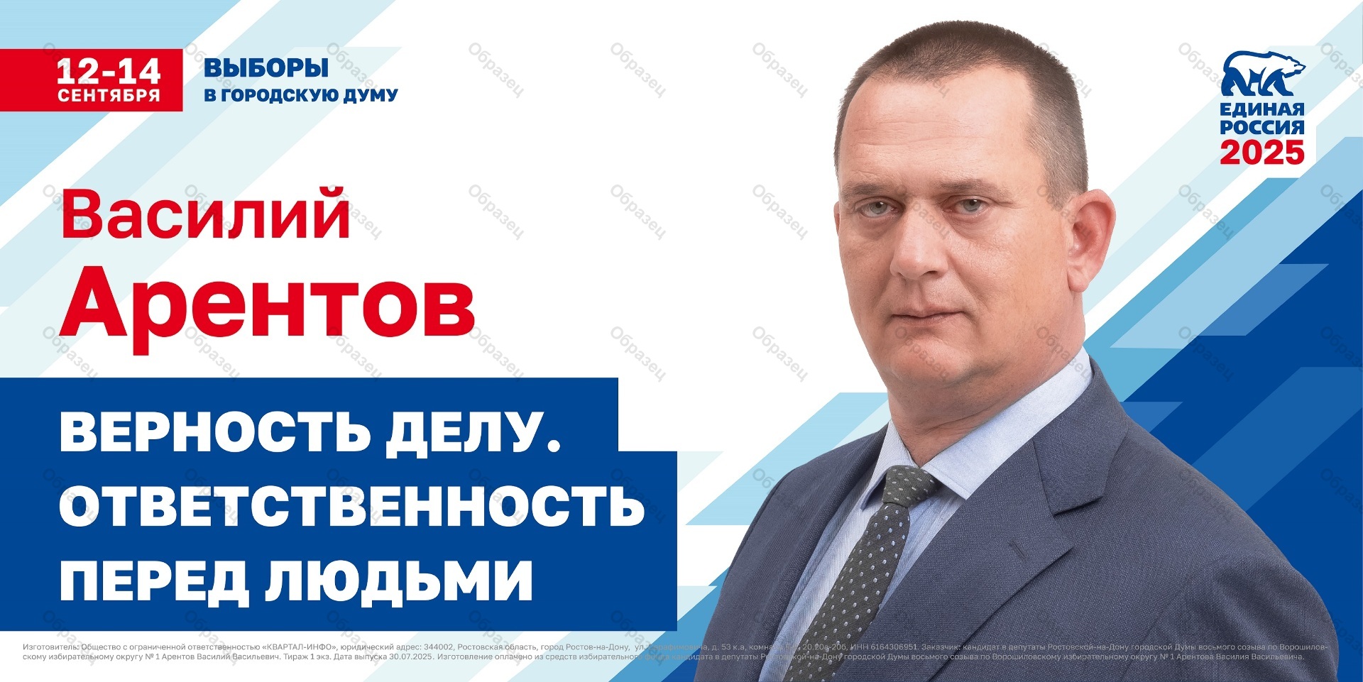 Изготовление оплачено из средств избирательного фонда кандидата в депутаты Ростовской-на-Дону городской Думы восьмого созыва по Ворошиловскому избирательному округу №1 Арентова Василия Васильевича