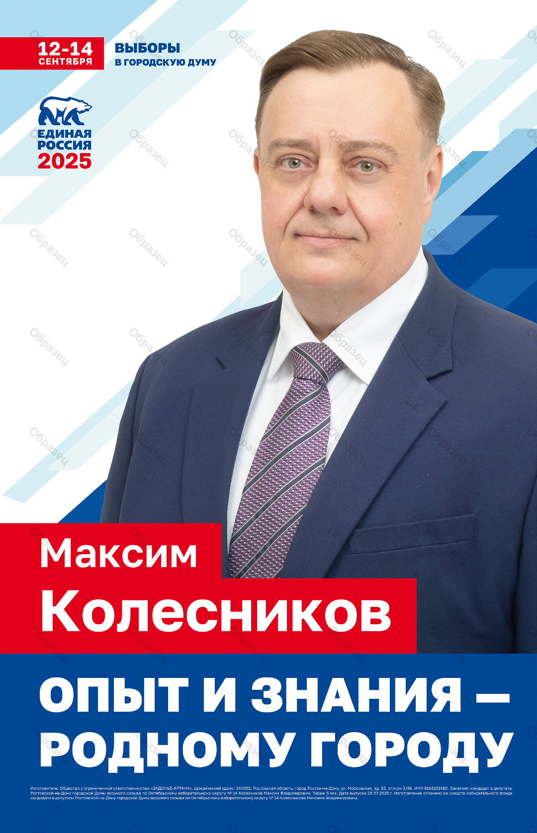 Изготовление оплачено из средств избирательного фонда кандидата в депутаты Ростовской-на-Дону городской Думы восьмого созыва по Октябрьскому избирательному округу № 14 Колесникова Максима Владимировича