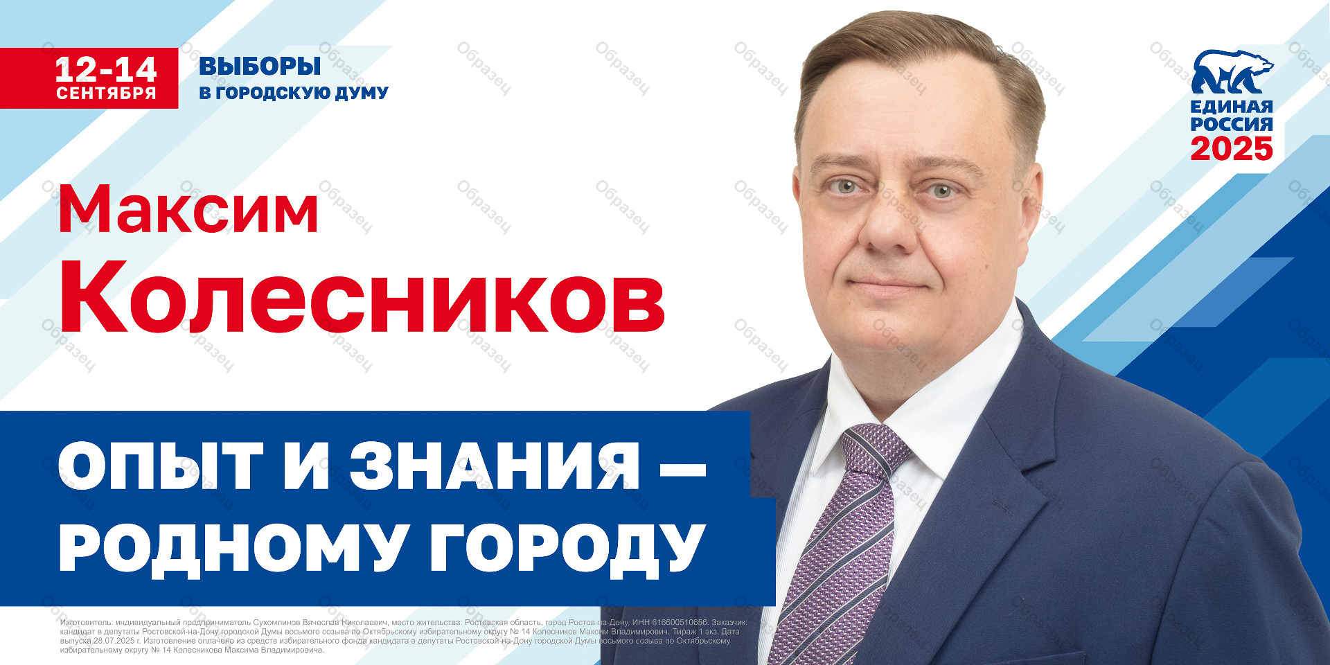| Заказчик | кандидат в депутаты Ростовской-на-Дону городской Думы восьмого созыва по Октябрьскому избирательному округу № 14 Колесников Максим Владимировича |