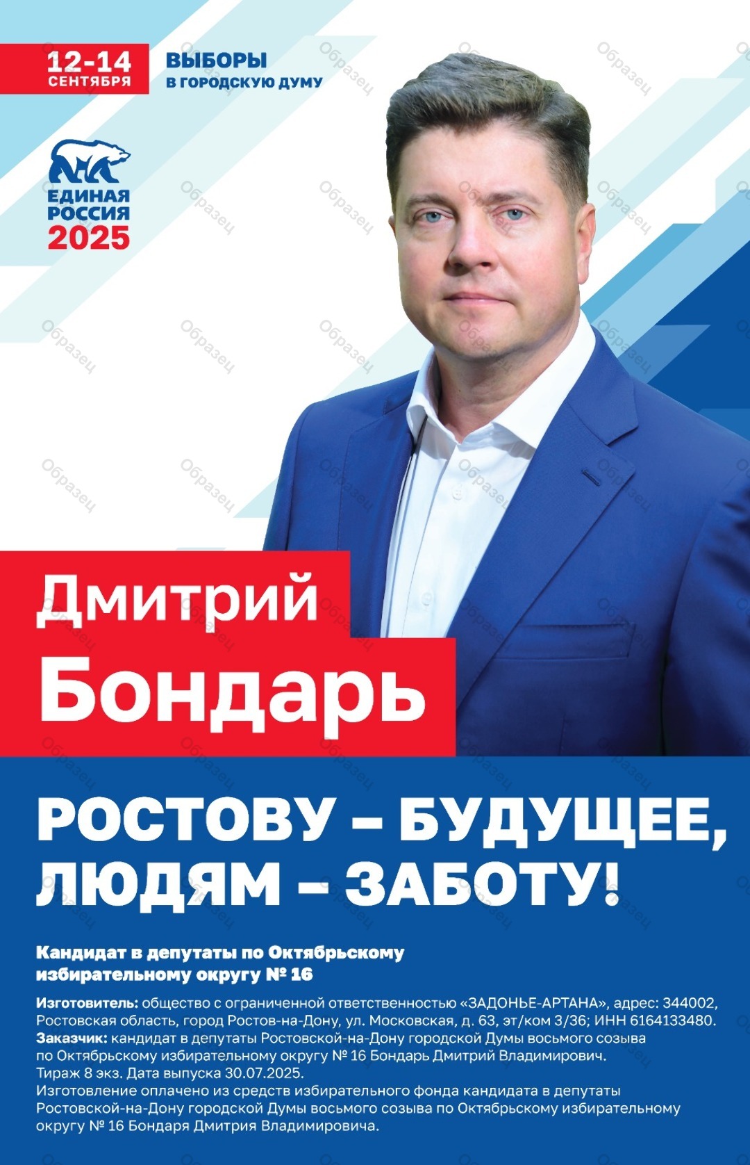 | Заказчик | кандидат в депутаты Ростовской-на-Дону городской Думы восьмого созыва по Октябрьскому избирательному округу № 16 Бондарь Дмитрий Владимирович |