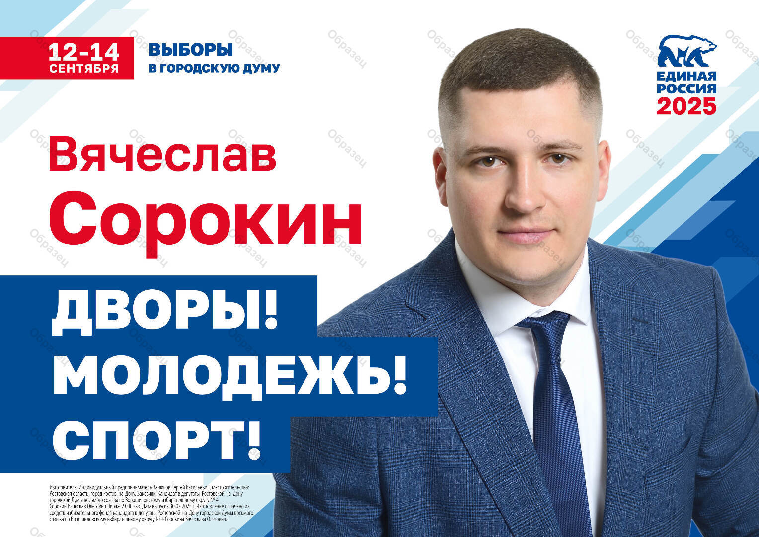 Изготовление оплачено из средств избирательного фонда кандидата в депутаты Ростовской-на-Дону городской Думы восьмого созыва по Ворошиловскому избирательному округу №4 Сорокина Вячеслава Олеговича