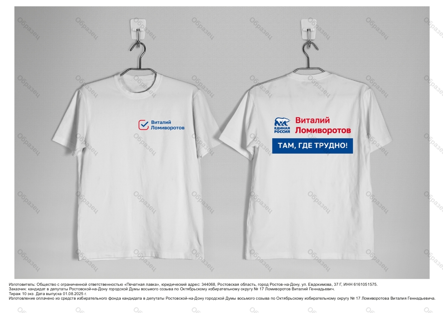 | Заказчик | кандидат в депутаты Ростовской-на-Дону городской Думы восьмого созыва по Октябрьскому избирательному округу № 17 Ломиворотов Виталий Геннадьевич |