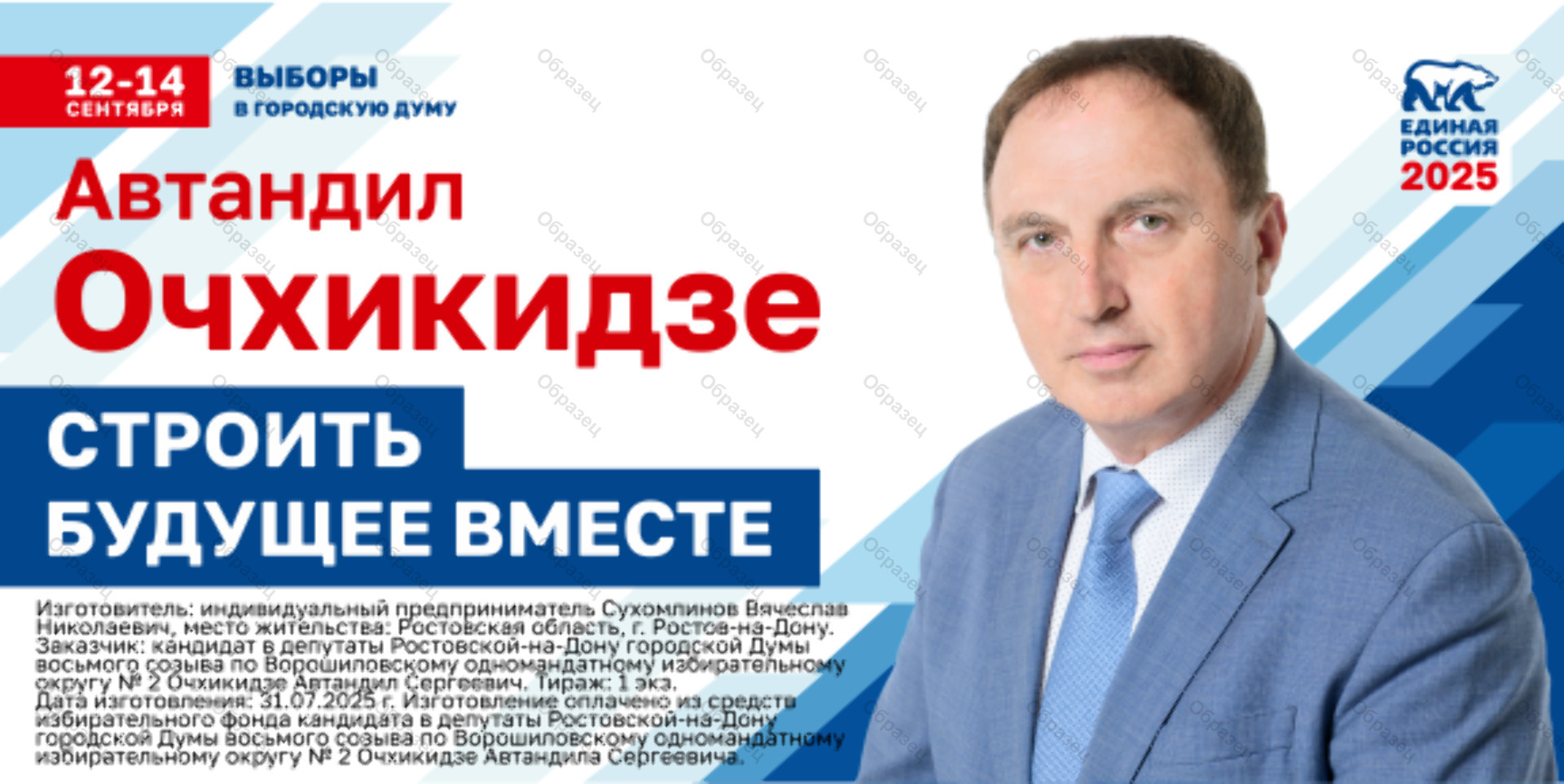 Изготовление оплачено из средств избирательного фонда кандидата в депутаты Ростовской-на-Дону городской Думы восьмого созыва по Ворошиловскому избирательному округу № 2 Очхикидзе Автандила Сергеевича