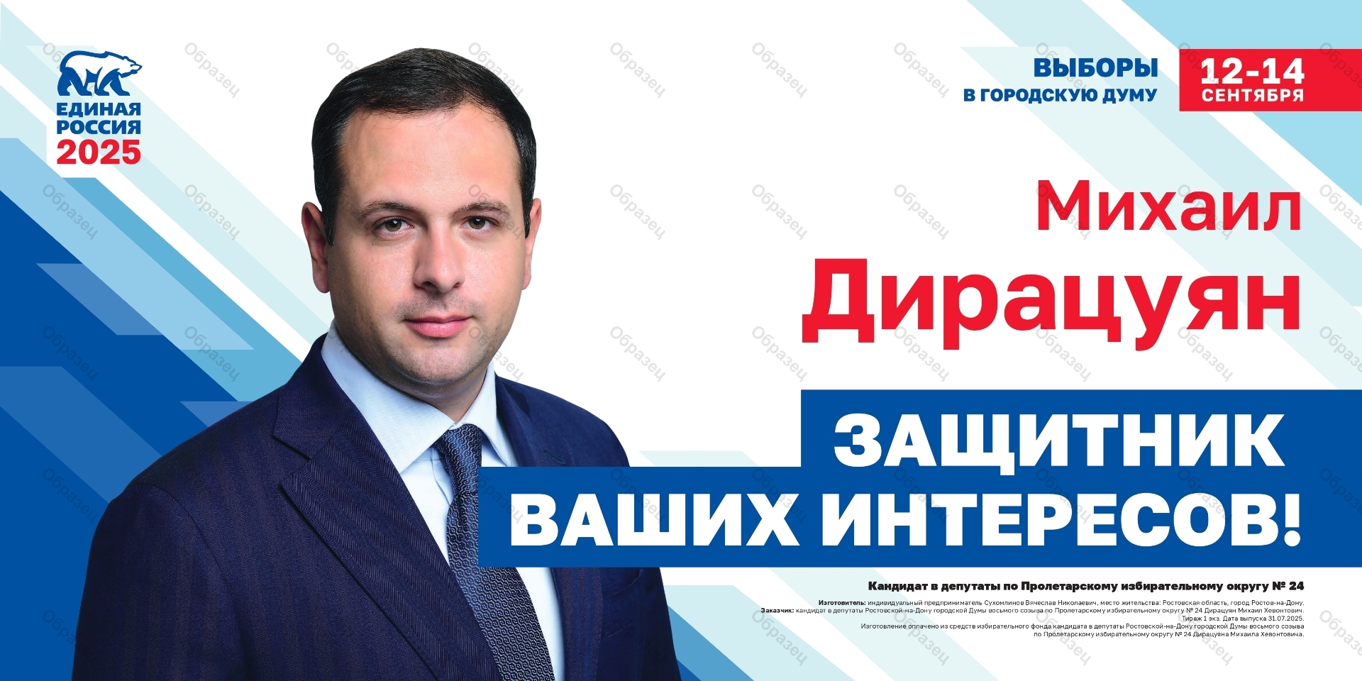 Оплачено из средств избирательного фонда кандидата в депутаты Ростовской-на-Дону городской Думы восьмого созыва Пролетарскому избирательному округу №24 Дирацуян Михаил Хевонтович