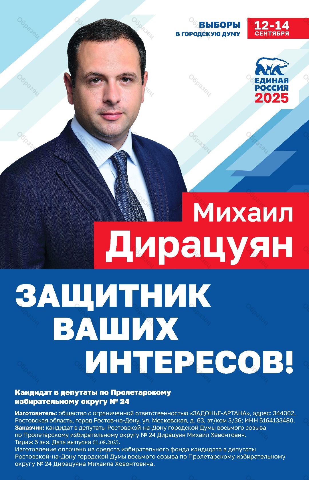 Оплачено из средств избирательного фонда кандидата в депутаты Ростовской-на-Дону городской Думы восьмого созыва Пролетарскому избирательному округу №24 Дирацуян Михаил Хевонтович