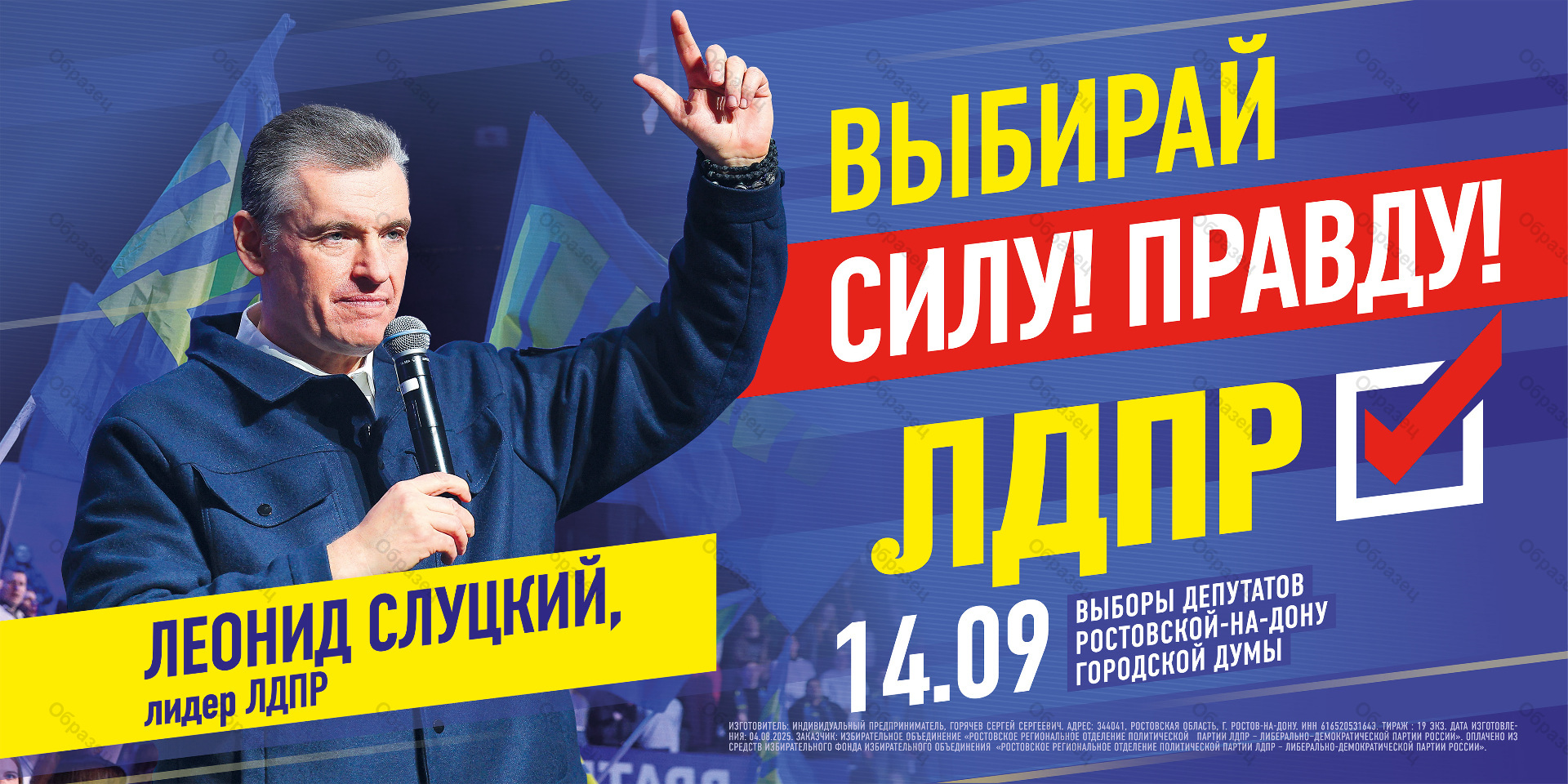 | Наименование агитационного материала | Слуцкий ВЫБИРАЙ СИЛУ! ПРАВДУ! ЛДПР! |