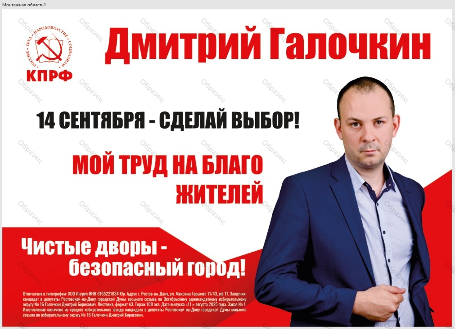 | Заказчик | кандидат в депутаты Ростовской-на-Дону городской Думы восьмого созыва по Октябрьскому избирательному округу № 16 Галочкин Дмитрий Борисович |