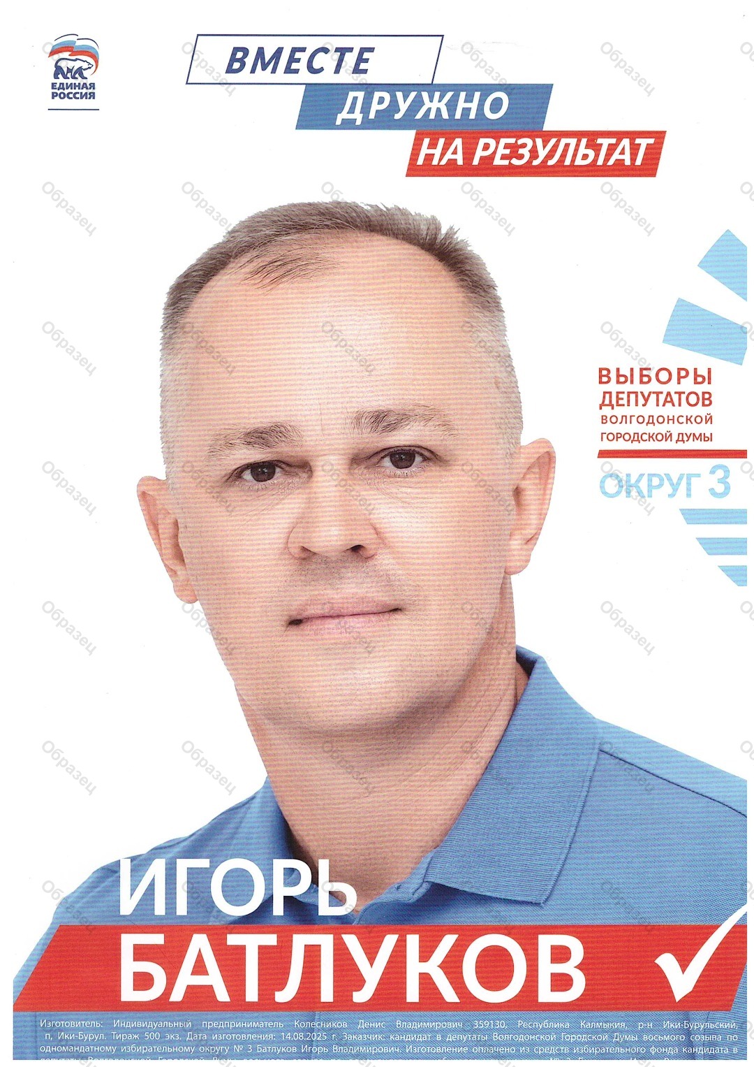 Оплачено из средств избирательного фонда кандидата в депутаты Волгодонской городской Думы восьмого созыва по одномандатному избирательному округу № 3 Батлукова Игоря Владимировича