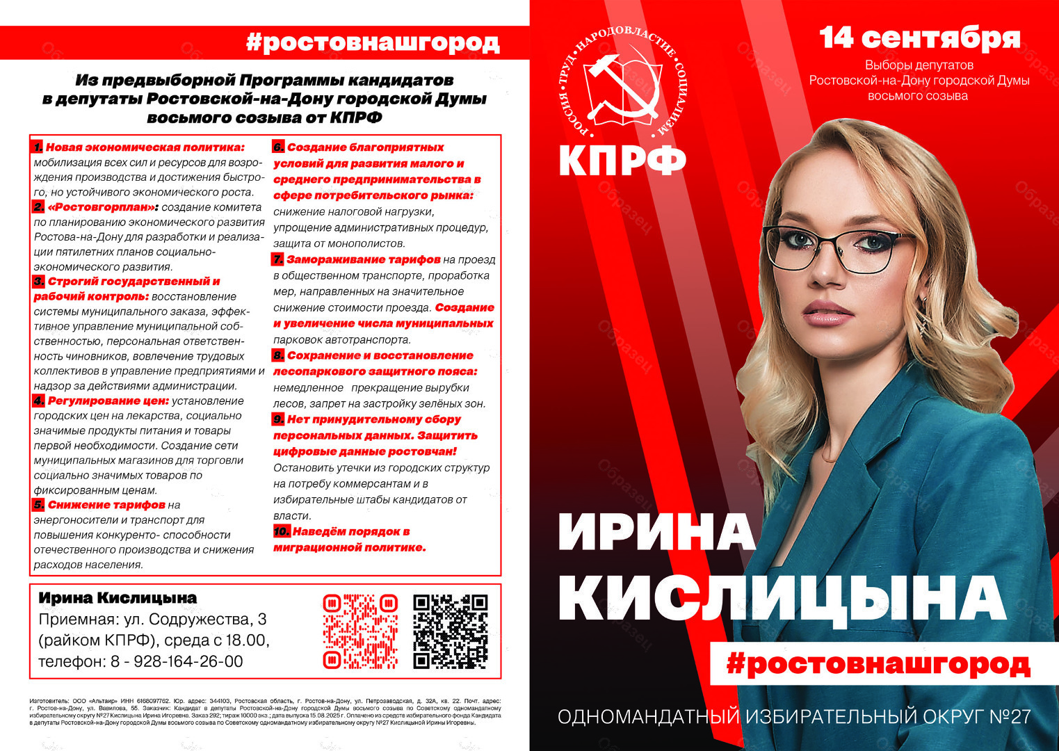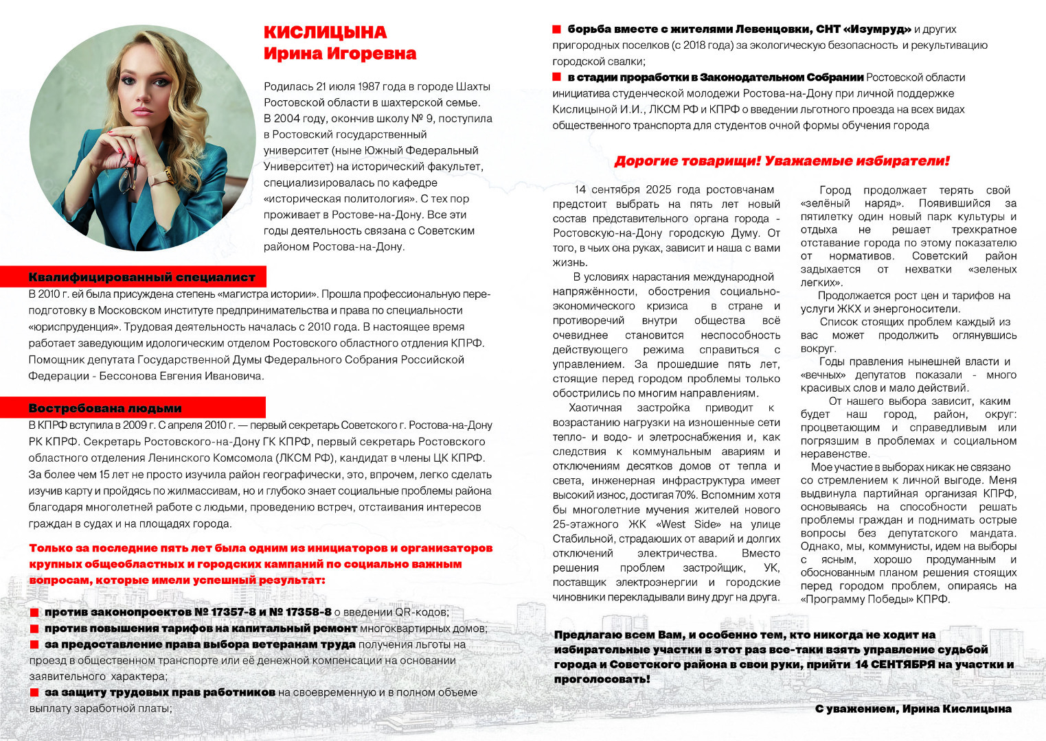 Оплачено из средств избирательного фонда кандидата в депутаты Ростовской-на-Дону городской Думы восьмого созыва по Советскому одномандатному избирательному округу № 27 Кислицыной Ирины Игоревнвы