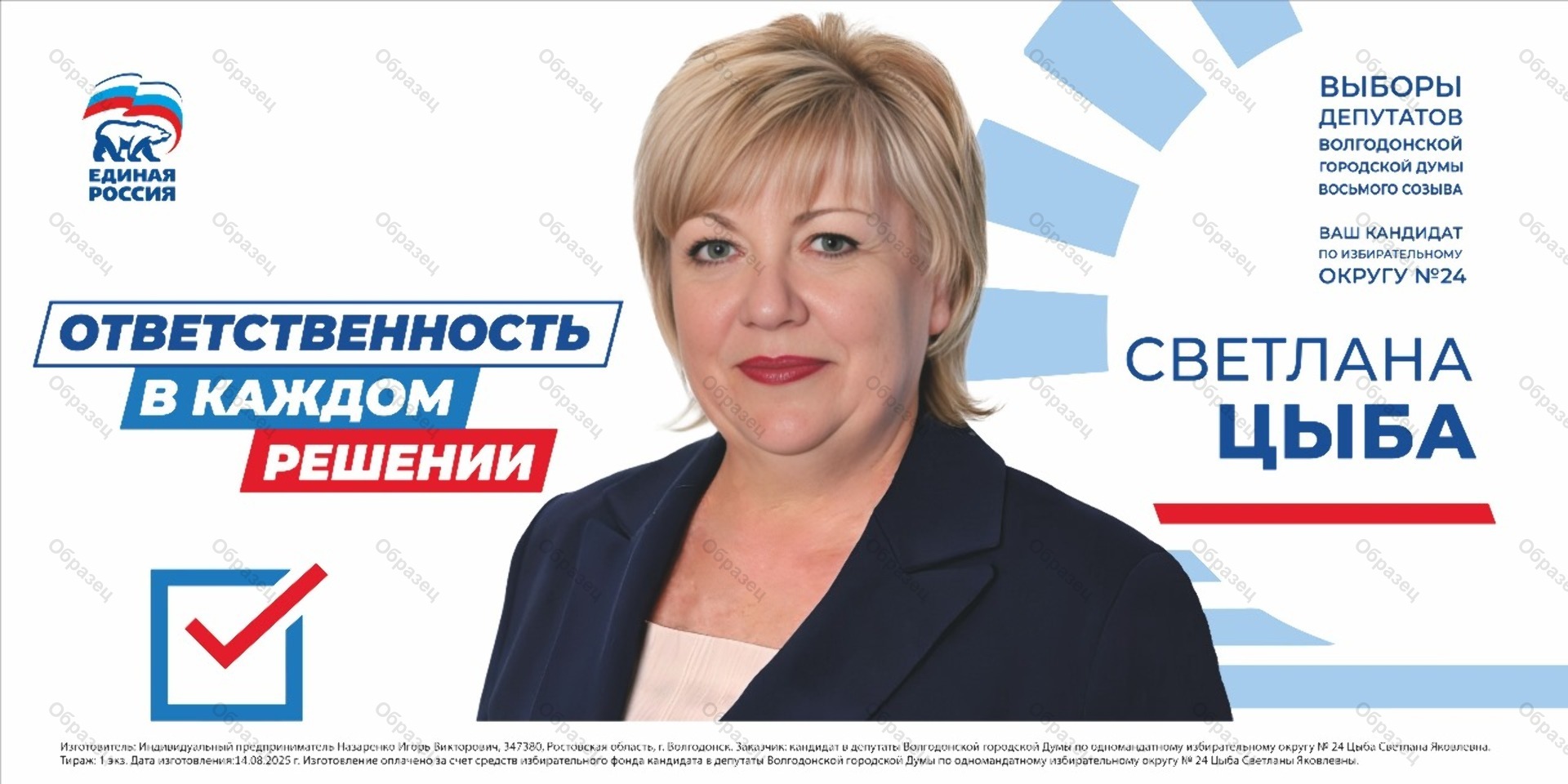 Оплачено за счет средств избирательного фонда кандидата в депутаты Волгодонской городской Думы восьмого созыва по одномандатному избирательному округу № 24 Цыба Светланы Яковлевны