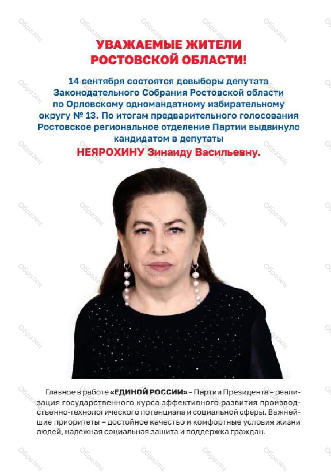 Оплачено из средств избирательного фонда кандидата в депутаты Законодательного Собрания Ростовской области седьмого созыва по Орловскому одномандатному избирательному округу № 13 Неярохиной Зинаиды Васильевны
